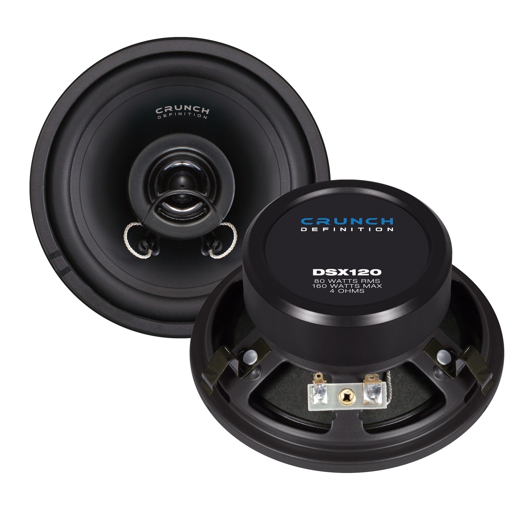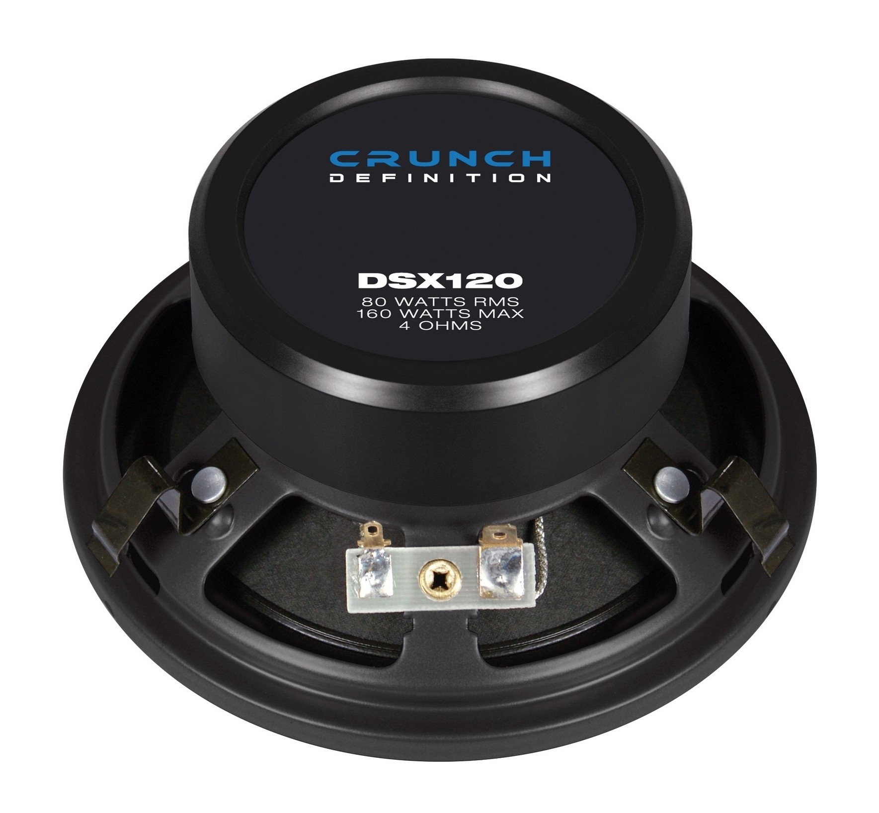 Crunch DSX120 jsou koaxiální reproduktory o průměru 120 mm, určené především pro vozidla se specifickými továrními instalačními otvory, kde nelze bez úprav použít běžné kulaté reproduktory standardních průměrů. Představují praktické řešení pro přímou náhradu sériových měničů bez nutnosti složitých adaptérů nebo zásahů do konstrukce dveří. Středobasový měnič využívá polypropylenovou membránu, 25 mm kmitací cívku a pevný ocelový koš, který zajišťuje dostatečnou tuhost konstrukce i při vyšším zatížení. O výškové pásmo se stará 13 mm výškový reproduktor s mylarovou kalotou, jenž přináší čistý a zřetelný projev ve vyšších frekvencích. Série DSX je navržena jako cenově dostupné a konstrukčně robustní řešení pro upgrade továrního ozvučení. Díky silným feritovým magnetům, stabilní mechanické konstrukci a vyváženému naladění nabízí výrazně lepší zvukový projev oproti sériovým reproduktorům při zachování jednoduché instalace a dlouhodobé spolehlivosti.