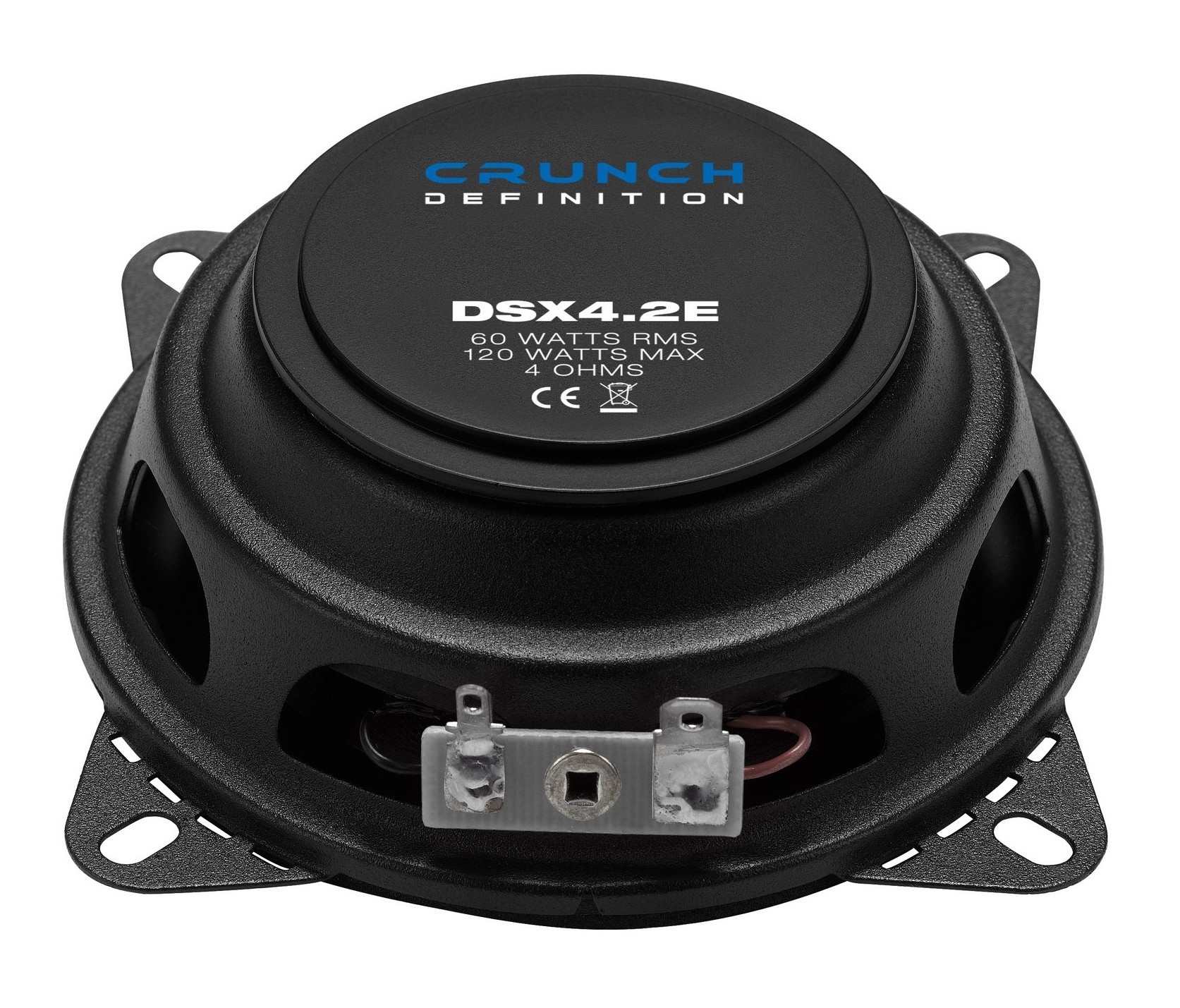Crunch DSX4.2E jsou 100 mm komponentní reproduktory v nízkoprofilovém provedení, navržené pro instalace s velmi omezenou montážní hloubkou. Konstrukce s vnitřně uloženým magnetickým systémem umožnila výrazně snížit hloubku koše bez zásadního omezení výkonu, což z nich dělá vhodnou volbu pro vozy s malým instalačním prostorem nebo při náhradě továrních reproduktorů. Středobasové měniče využívají polypropylenovou membránu, 25 mm kmitací cívku a stabilní ocelový koš v plochém provedení. O výšky se starají 25 mm výškové reproduktory s hedvábnou kalotou a neodymovým magnetem, které jsou otočné pro lepší směrování do poslechového prostoru. Součástí systému jsou kompaktní 12 dB výhybky pro středobas a výšky zvlášť. DSX série je určena především pro úsporné instalace, kde je prioritou montážní prostor a jednoduchá náhrada sériových reproduktorů.