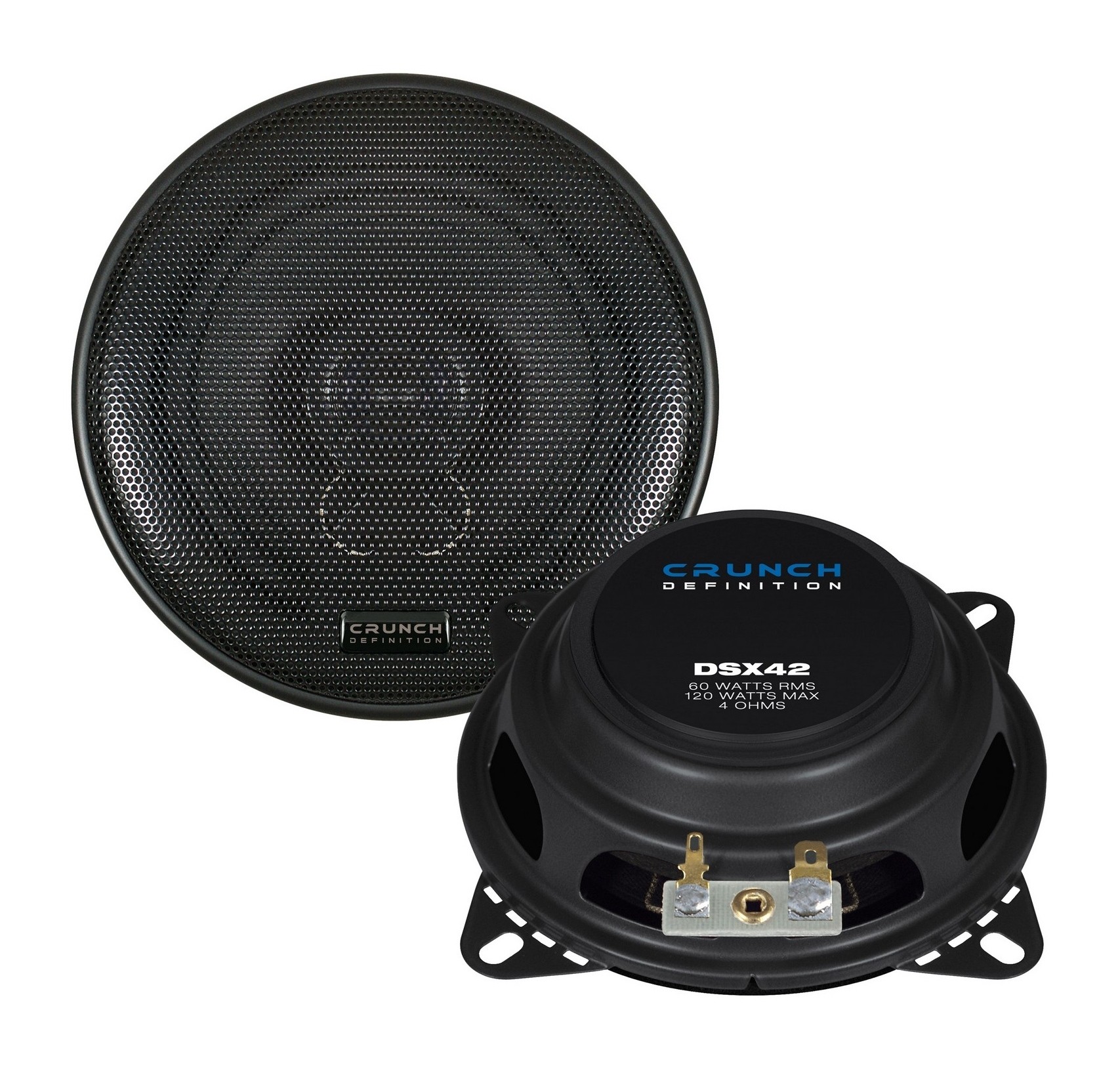 Crunch DSX42 jsou 100 mm koaxiální reproduktory v nízkoprofilovém provedení, navržené pro instalace s velmi omezenou montážní hloubkou. Konstrukce s vnitřně uloženým magnetickým systémem umožnila výrazně snížit hloubku koše bez zásadního omezení výkonu, což z nich dělá vhodnou volbu pro vozy s malým instalačním prostorem nebo při náhradě továrních reproduktorů. Středobasové měniče využívají polypropylenovou membránu, 25 mm kmitací cívku a stabilní ocelový koš v plochém provedení. O výšky se starají 13 mm výškové reproduktory s mylarovou kalotou. DSX série je určena především pro úsporné instalace, kde je prioritou montážní prostor a jednoduchá náhrada sériových reproduktorů.