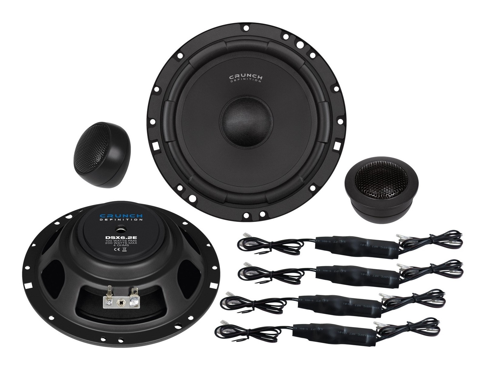 Crunch DSX6.2E jsou 165 mm komponentní reproduktory v nízkoprofilovém provedení, navržené pro instalace s velmi omezenou montážní hloubkou. Konstrukce s vnitřně uloženým magnetickým systémem umožnila výrazně snížit hloubku koše bez zásadního omezení výkonu, což z nich dělá vhodnou volbu pro vozy s malým instalačním prostorem nebo při náhradě továrních reproduktorů. Středobasové měniče využívají polypropylenovou membránu, 25 mm kmitací cívku a stabilní ocelový koš v plochém provedení. O výšky se starají 25 mm výškové reproduktory s hedvábnou kalotou a neodymovým magnetem, které jsou otočné pro lepší směrování do poslechového prostoru. Součástí systému jsou kompaktní 12 dB výhybky pro středobas a výšky zvlášť. DSX série je určena především pro úsporné instalace, kde je prioritou montážní prostor a jednoduchá náhrada sériových reproduktorů.