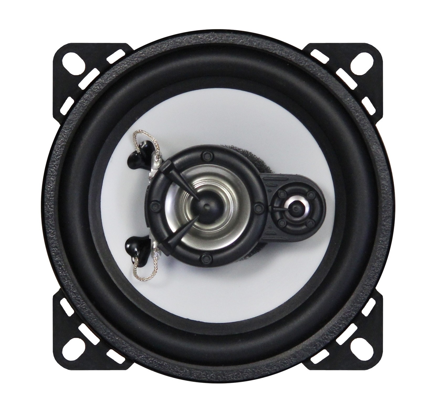 | Typ reproduktorůKoaxiální reproduktory: Koaxiální reproduktory se vyznačují konstrukcí tzv. vše v jednom. Výškový a středobasový reproduktor jsou v jednom koši. Výhodou je jednodušší montáž, ale díky spojení resp. blízkosti pásem v jednom reproduktoru, se obvykle sníží kvalita zvuku. Zpravidla uprostřed středobasového reproduktoru, je výškový reproduktor, jehož kmitací cívka pracuje ve druhé vzduchové mezeře společného magnatického obvodu. Třípásmový koaxiální reproduktor se skládá ze středobasového reproduktoru, ve předu na zvláštním nosníku je středový reproduktor a samostatný výškový. Komponentní reproduktory: Komponentní reproduktory se vyznačují rozdělením na jednotlivá frekvenční pásma, výškové + středobasové + popř. basové pásmo. Jednotlivé reproduktory se dají umístit zcela odděleně, což má za výsledek lepší zvukový i akustický projev. V drtivé většině případů komponentních reproduktorů je dodávaná i externí výhybka, která rozděluje výškové, středové / středobasové a u třípásma i basové pásmo popř. umožňuje nastavení decibelové úrovně u výškového reproduktoru (např. +2 dB, 0 dB, -2 dB), strmosti (např. 6dB/Okt. 12dB/Okt.) či aktivní nebo bi-amp zapojení. | Koaxiální |