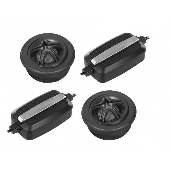 | Typ reproduktorůKoaxiální reproduktory: Koaxiální reproduktory se vyznačují konstrukcí tzv. vše v jednom. Výškový a středobasový reproduktor jsou v jednom koši. Výhodou je jednodušší montáž, ale díky spojení resp. blízkosti pásem v jednom reproduktoru, se obvykle sníží kvalita zvuku. Zpravidla uprostřed středobasového reproduktoru, je výškový reproduktor, jehož kmitací cívka pracuje ve druhé vzduchové mezeře společného magnatického obvodu. Třípásmový koaxiální reproduktor se skládá ze středobasového reproduktoru, ve předu na zvláštním nosníku je středový reproduktor a samostatný výškový. Komponentní reproduktory: Komponentní reproduktory se vyznačují rozdělením na jednotlivá frekvenční pásma, výškové + středobasové + popř. basové pásmo. Jednotlivé reproduktory se dají umístit zcela odděleně, což má za výsledek lepší zvukový i akustický projev. V drtivé většině případů komponentních reproduktorů je dodávaná i externí výhybka, která rozděluje výškové, středové / středobasové a u třípásma i basové pásmo popř. umožňuje nastavení decibelové úrovně u výškového reproduktoru (např. +2 dB, 0 dB, -2 dB), strmosti (např. 6dB/Okt. 12dB/Okt.) či aktivní nebo bi-amp zapojení. | Výškový |