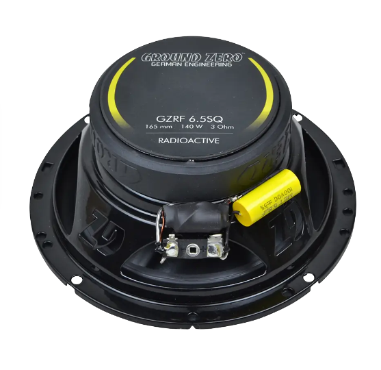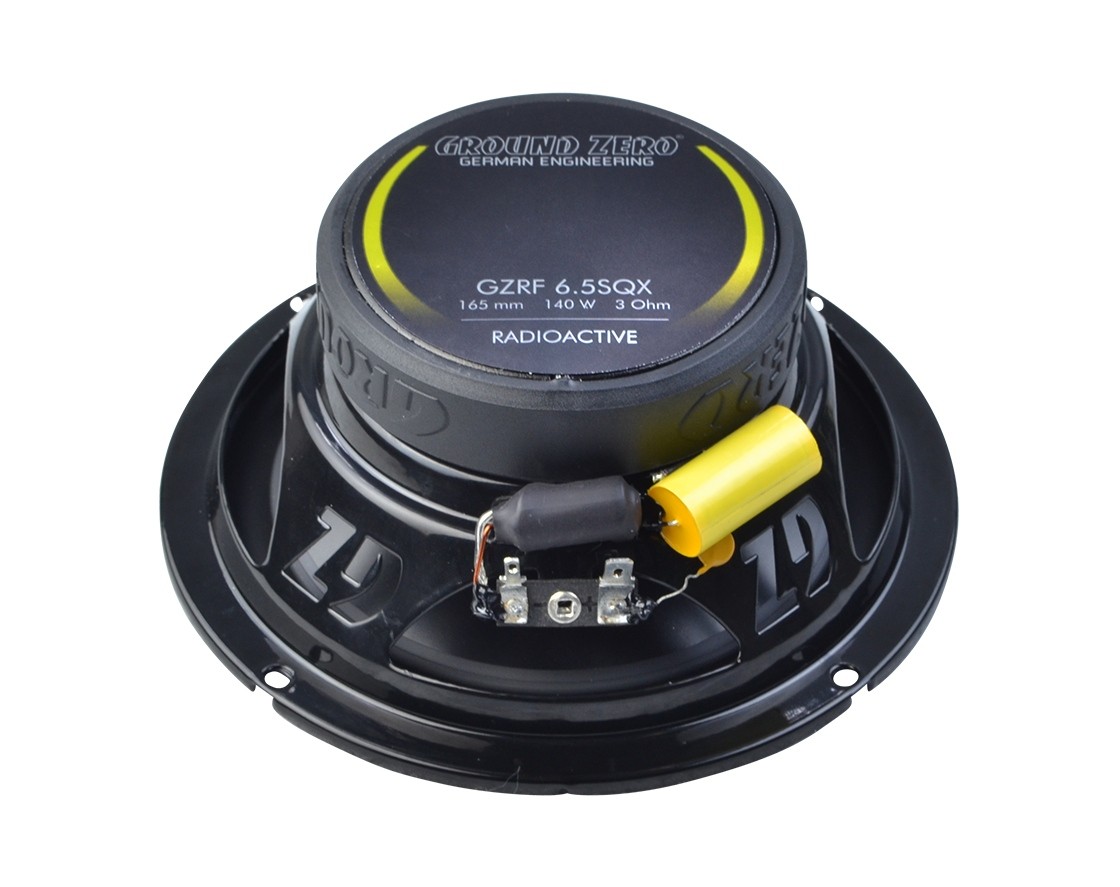 Koaxiální reproduktorový systém Ground Zero GZRF 6.5SQX z modelové řady Radioactive je první z produktových řad GZ, která je navržena pro sound quality instalace. Středobasový reproduktor využívá černou eloxovanou hliníkovou membránu, která kombinuje nízkou hmotnost a vysokou tuhost pro maximální přesnost, rychlou odezvu a minimální zkreslení. Masivní hliníkový phase plug zlepšuje směrovost středních frekvencí a zároveň efektivně odvádí teplo od cívky, čímž podporuje dlouhodobou stabilitu výkonu. Membrána je osazena měděnou prachovkou pro lineární průběh impedance, což zlepšuje stabilitu přenosu a snižuje zkreslení. Dále reproduktory disponují 3ohmovou impedancí pro vyšší efektivitu, nomexový spiderem, pryžovým závěsem a rezonančně neutrálním ocelovým košem. Výškový reproduktor s 25mm kalotou z hedvábí a neodymovým motorem přináší jemné a detailní výšky.