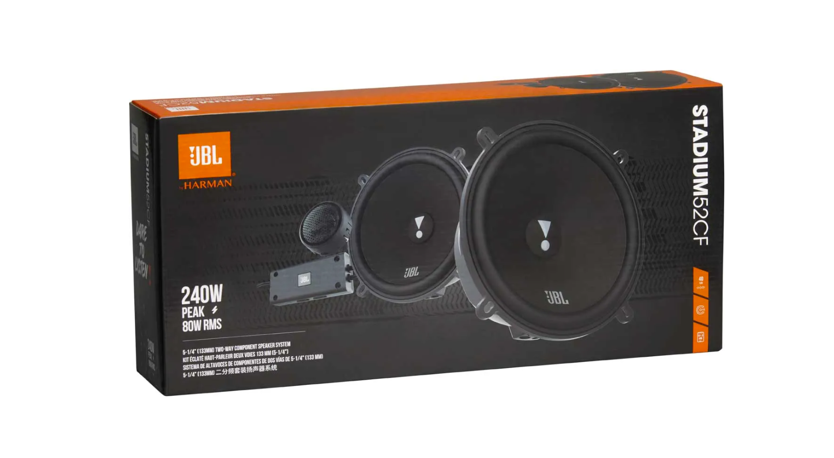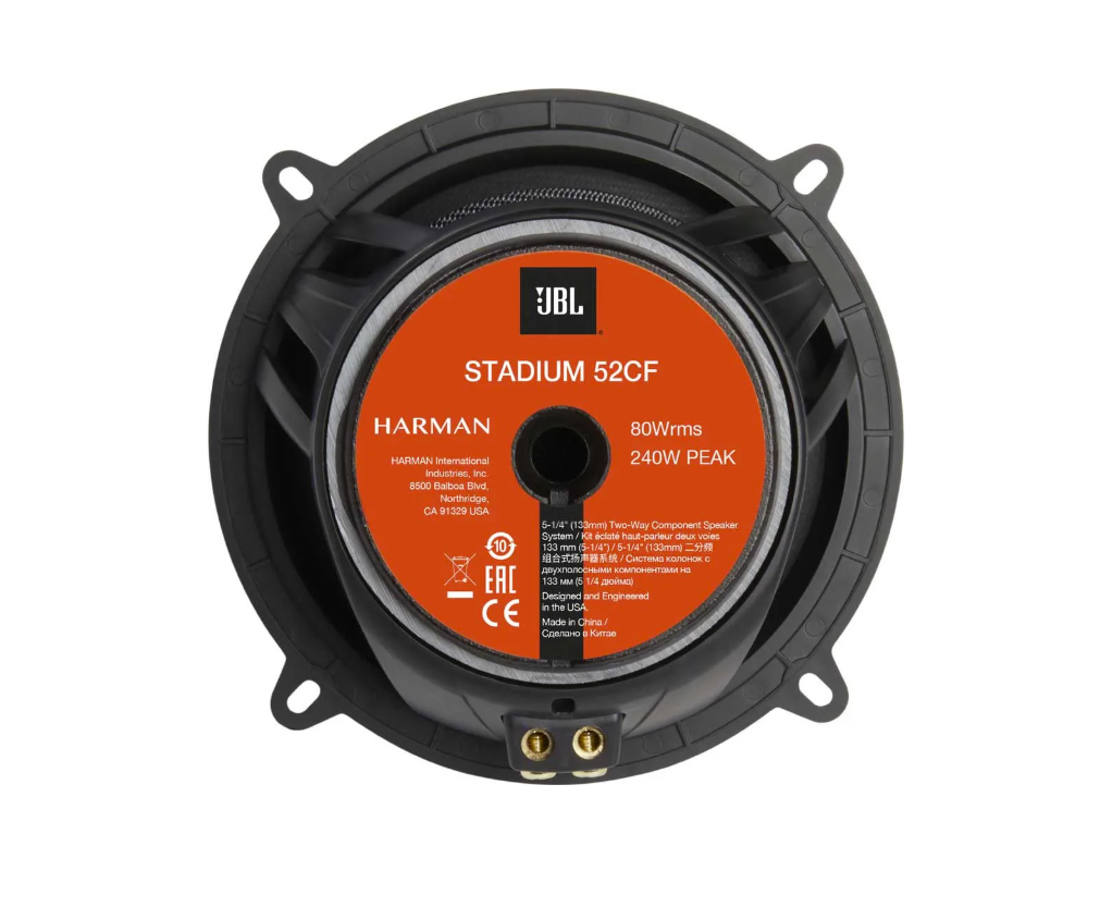 Komponentní reproduktory JBL Stadium 52CF z prémiové série Stadium jsou navrženy pro náročné posluchače, kteří chtějí výrazně lepší zvuk než nabízí běžné tovární ozvučení automobilu. Tento 2-pásmový komponentní systém s 5,25" (130 mm) woofery a samostatnými tweeteri přináší velmi detailní podání hudby, silné basy a čisté výšky s rozsahem až do 40 kHz, což umožňuje reprodukci i velmi jemných detailů v nahrávce.