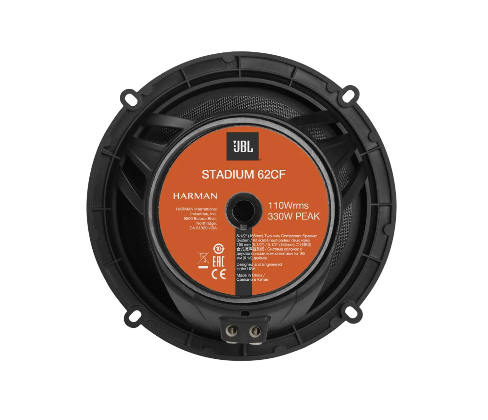 Komponentní reproduktory JBL Stadium 62CF z prémiové série Stadium jsou navrženy pro náročné posluchače, kteří chtějí výrazně lepší zvuk než nabízí běžné tovární ozvučení automobilu. Tento 2-pásmový komponentní systém s 6,5" (165 mm) woofery a samostatnými tweeteri přináší velmi detailní podání hudby, silné basy a čisté výšky s rozsahem až do 40 kHz, což umožňuje reprodukci i velmi jemných detailů v nahrávce.