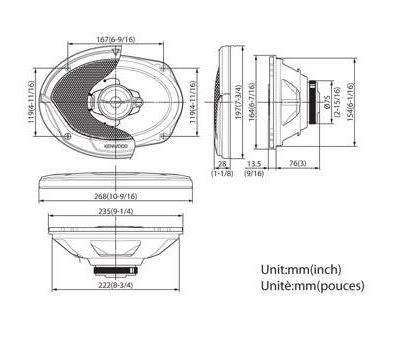 | Průměr středobasového reproduktoruPrůměr reproduktoru uvádíme jako průměr celého reproduktoru, nikoliv včetně uchycení, kdy u menších reproduktorů (87, 100, 130 mm) vyčnívají ještě navíc úchyty. Některé reproduktory jsou oválné a tam se uvádí rozměr v palcích, vždy nejkratší strana k nejdelší straně. Jeden palce je cca. 2,5 cm. | 6 x 9 " |