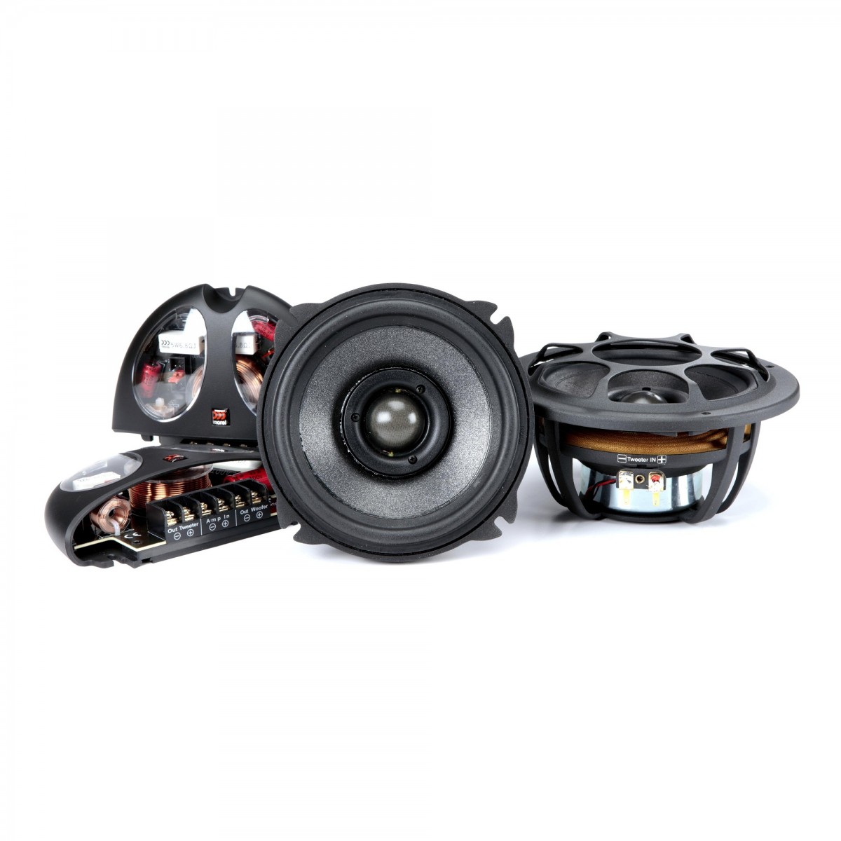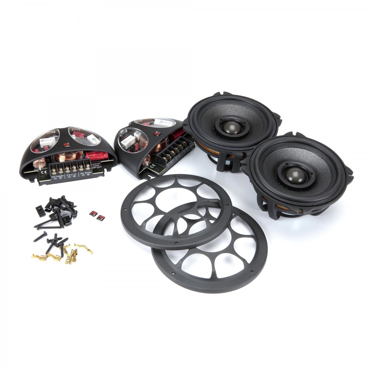 | Typ reproduktorůKoaxiální reproduktory: Koaxiální reproduktory se vyznačují konstrukcí tzv. vše v jednom. Výškový a středobasový reproduktor jsou v jednom koši. Výhodou je jednodušší montáž, ale díky spojení resp. blízkosti pásem v jednom reproduktoru, se obvykle sníží kvalita zvuku. Zpravidla uprostřed středobasového reproduktoru, je výškový reproduktor, jehož kmitací cívka pracuje ve druhé vzduchové mezeře společného magnatického obvodu. Třípásmový koaxiální reproduktor se skládá ze středobasového reproduktoru, ve předu na zvláštním nosníku je středový reproduktor a samostatný výškový. Komponentní reproduktory: Komponentní reproduktory se vyznačují rozdělením na jednotlivá frekvenční pásma, výškové + středobasové + popř. basové pásmo. Jednotlivé reproduktory se dají umístit zcela odděleně, což má za výsledek lepší zvukový i akustický projev. V drtivé většině případů komponentních reproduktorů je dodávaná i externí výhybka, která rozděluje výškové, středové / středobasové a u třípásma i basové pásmo popř. umožňuje nastavení decibelové úrovně u výškového reproduktoru (např. +2 dB, 0 dB, -2 dB), strmosti (např. 6dB/Okt. 12dB/Okt.) či aktivní nebo bi-amp zapojení. | Koaxiální 2pásmové |