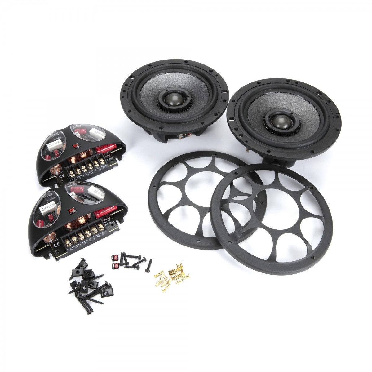 | Typ reproduktorůKoaxiální reproduktory: Koaxiální reproduktory se vyznačují konstrukcí tzv. vše v jednom. Výškový a středobasový reproduktor jsou v jednom koši. Výhodou je jednodušší montáž, ale díky spojení resp. blízkosti pásem v jednom reproduktoru, se obvykle sníží kvalita zvuku. Zpravidla uprostřed středobasového reproduktoru, je výškový reproduktor, jehož kmitací cívka pracuje ve druhé vzduchové mezeře společného magnatického obvodu. Třípásmový koaxiální reproduktor se skládá ze středobasového reproduktoru, ve předu na zvláštním nosníku je středový reproduktor a samostatný výškový. Komponentní reproduktory: Komponentní reproduktory se vyznačují rozdělením na jednotlivá frekvenční pásma, výškové + středobasové + popř. basové pásmo. Jednotlivé reproduktory se dají umístit zcela odděleně, což má za výsledek lepší zvukový i akustický projev. V drtivé většině případů komponentních reproduktorů je dodávaná i externí výhybka, která rozděluje výškové, středové / středobasové a u třípásma i basové pásmo popř. umožňuje nastavení decibelové úrovně u výškového reproduktoru (např. +2 dB, 0 dB, -2 dB), strmosti (např. 6dB/Okt. 12dB/Okt.) či aktivní nebo bi-amp zapojení. | Koaxiální 2pásmové |