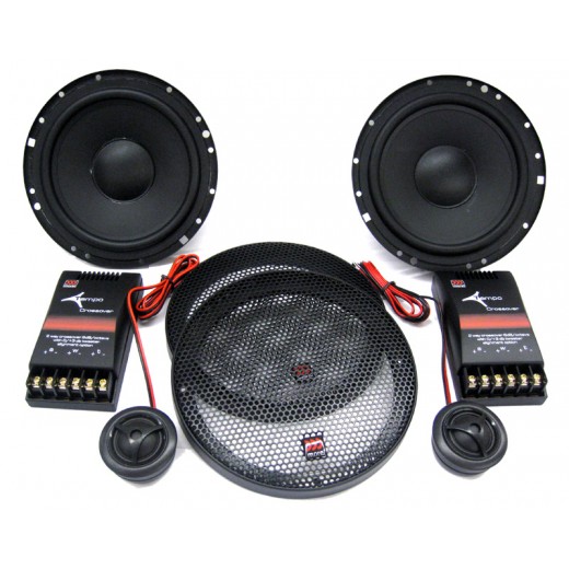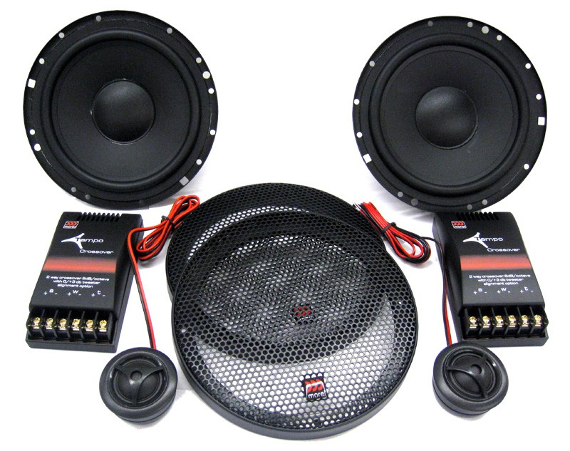 | Typ reproduktorůKoaxiální reproduktory: Koaxiální reproduktory se vyznačují konstrukcí tzv. vše v jednom. Výškový a středobasový reproduktor jsou v jednom koši. Výhodou je jednodušší montáž, ale díky spojení resp. blízkosti pásem v jednom reproduktoru, se obvykle sníží kvalita zvuku. Zpravidla uprostřed středobasového reproduktoru, je výškový reproduktor, jehož kmitací cívka pracuje ve druhé vzduchové mezeře společného magnatického obvodu. Třípásmový koaxiální reproduktor se skládá ze středobasového reproduktoru, ve předu na zvláštním nosníku je středový reproduktor a samostatný výškový. Komponentní reproduktory: Komponentní reproduktory se vyznačují rozdělením na jednotlivá frekvenční pásma, výškové + středobasové + popř. basové pásmo. Jednotlivé reproduktory se dají umístit zcela odděleně, což má za výsledek lepší zvukový i akustický projev. V drtivé většině případů komponentních reproduktorů je dodávaná i externí výhybka, která rozděluje výškové, středové / středobasové a u třípásma i basové pásmo popř. umožňuje nastavení decibelové úrovně u výškového reproduktoru (např. +2 dB, 0 dB, -2 dB), strmosti (např. 6dB/Okt. 12dB/Okt.) či aktivní nebo bi-amp zapojení. | komponentní 2 pásmové |