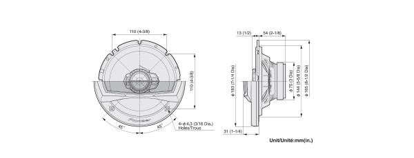 | Průměr středobasového reproduktoruPrůměr reproduktoru uvádíme jako průměr celého reproduktoru, nikoliv včetně uchycení, kdy u menších reproduktorů (87, 100, 130 mm) vyčnívají ještě navíc úchyty. Některé reproduktory jsou oválné a tam se uvádí rozměr v palcích, vždy nejkratší strana k nejdelší straně. Jeden palce je cca. 2,5 cm. | 165 mm |