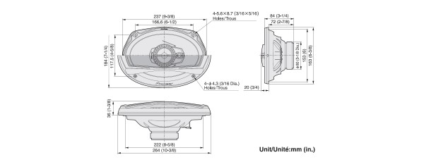 | Průměr středobasového reproduktoruPrůměr reproduktoru uvádíme jako průměr celého reproduktoru, nikoliv včetně uchycení, kdy u menších reproduktorů (87, 100, 130 mm) vyčnívají ještě navíc úchyty. Některé reproduktory jsou oválné a tam se uvádí rozměr v palcích, vždy nejkratší strana k nejdelší straně. Jeden palce je cca. 2,5 cm. | 6 x 9 " |