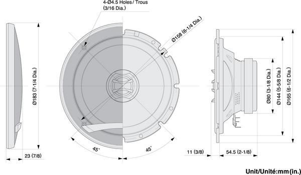| Montážní hloubka středobasového reproduktoruMontážní hloubka reproduktoru se měří od nejspodnější hrany magnetu až po spodní okraj plechového, plastového nebo litého koše reproduktoru, resp. dosedací plochy reproduktoru. | 54,5 mm |