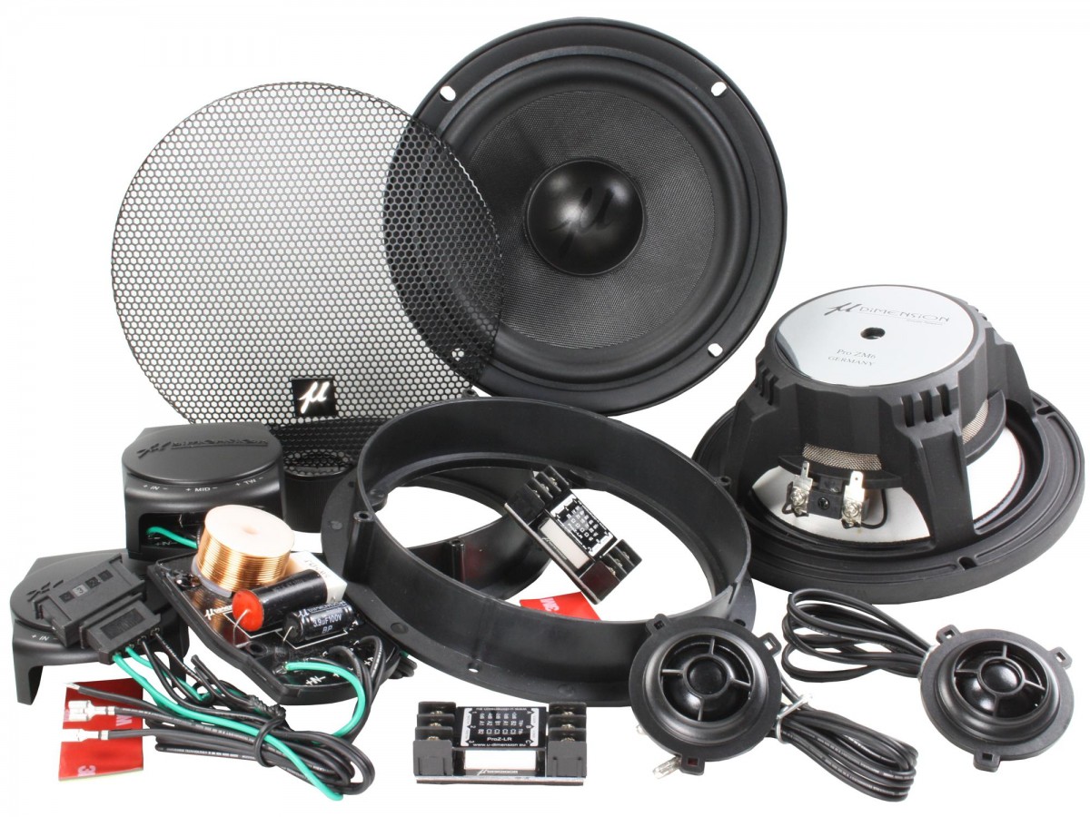 | Typ reproduktorůKoaxiální reproduktory: Koaxiální reproduktory se vyznačují konstrukcí tzv. vše v jednom. Výškový a středobasový reproduktor jsou v jednom koši. Výhodou je jednodušší montáž, ale díky spojení resp. blízkosti pásem v jednom reproduktoru, se obvykle sníží kvalita zvuku. Zpravidla uprostřed středobasového reproduktoru, je výškový reproduktor, jehož kmitací cívka pracuje ve druhé vzduchové mezeře společného magnatického obvodu. Třípásmový koaxiální reproduktor se skládá ze středobasového reproduktoru, ve předu na zvláštním nosníku je středový reproduktor a samostatný výškový. Komponentní reproduktory: Komponentní reproduktory se vyznačují rozdělením na jednotlivá frekvenční pásma, výškové + středobasové + popř. basové pásmo. Jednotlivé reproduktory se dají umístit zcela odděleně, což má za výsledek lepší zvukový i akustický projev. V drtivé většině případů komponentních reproduktorů je dodávaná i externí výhybka, která rozděluje výškové, středové / středobasové a u třípásma i basové pásmo popř. umožňuje nastavení decibelové úrovně u výškového reproduktoru (např. +2 dB, 0 dB, -2 dB), strmosti (např. 6dB/Okt. 12dB/Okt.) či aktivní nebo bi-amp zapojení. | Komponentní 2 pásmové |