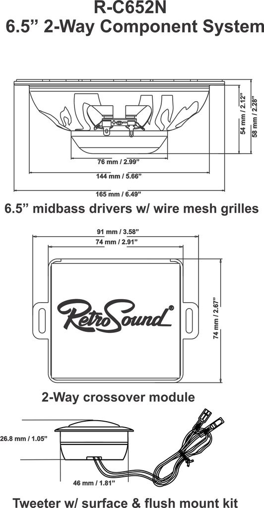 RetroSound R-C652N jsou ty správné reproduktory pro vaše historické vozidlo. RetroSound usnadňuje výměnu továrních reproduktorů v téměř každém autě - klasickém, historickém nebo dokonce zcela novém. Jejich reproduktory řady RetroMod mají extrémně mělké koše navržené tak, aby se vešly do široké škály standardních umístění reproduktorů. Možná vypadají ze staré školy, ale RetroSound staví své reproduktory od základů pomocí nejnovějších technik a materiálů. Každý basový reproduktor ze sady R-C652N je vybaven výkonným neodymovým magnetem a košem z nízkouhlíkové oceli, které tvoří pevný základ. Pevná polypropylenová membrána poskytuje vysoký výkon, zatímco odolává vlhkosti a vlhkosti. Samostatný výškový reproduktor s hedvábnou kalotou vysílá detailní výšky, aniž by zněl pronikavě, a dodává se s vodotěsnými nebo povrchově odolnými možnostmi montáže.