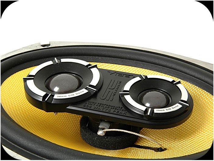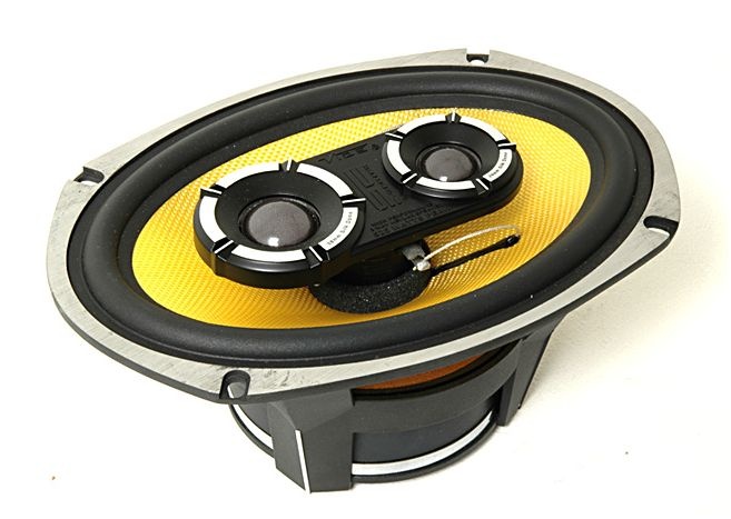 | Typ reproduktorůKoaxiální reproduktory: Koaxiální reproduktory se vyznačují konstrukcí tzv. vše v jednom. Výškový a středobasový reproduktor jsou v jednom koši. Výhodou je jednodušší montáž, ale díky spojení resp. blízkosti pásem v jednom reproduktoru, se obvykle sníží kvalita zvuku. Zpravidla uprostřed středobasového reproduktoru, je výškový reproduktor, jehož kmitací cívka pracuje ve druhé vzduchové mezeře společného magnatického obvodu. Třípásmový koaxiální reproduktor se skládá ze středobasového reproduktoru, ve předu na zvláštním nosníku je středový reproduktor a samostatný výškový. Komponentní reproduktory: Komponentní reproduktory se vyznačují rozdělením na jednotlivá frekvenční pásma, výškové + středobasové + popř. basové pásmo. Jednotlivé reproduktory se dají umístit zcela odděleně, což má za výsledek lepší zvukový i akustický projev. V drtivé většině případů komponentních reproduktorů je dodávaná i externí výhybka, která rozděluje výškové, středové / středobasové a u třípásma i basové pásmo popř. umožňuje nastavení decibelové úrovně u výškového reproduktoru (např. +2 dB, 0 dB, -2 dB), strmosti (např. 6dB/Okt. 12dB/Okt.) či aktivní nebo bi-amp zapojení. | koaxiální 3 pásmové |