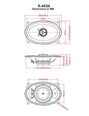 | Rozměr středobasového reproduktoruPrůměr reproduktoru uvádíme jako průměr celého reproduktoru, nikoliv včetně uchycení, kdy u menších reproduktorů (87, 100, 130 mm) vyčnívají ještě navíc úchyty. Některé reproduktory jsou oválné a tam se uvádí rozměr v palcích, vždy nejkratší strana k nejdelší straně. Jeden palce je cca. 2,5 cm. | 4" x 6" |