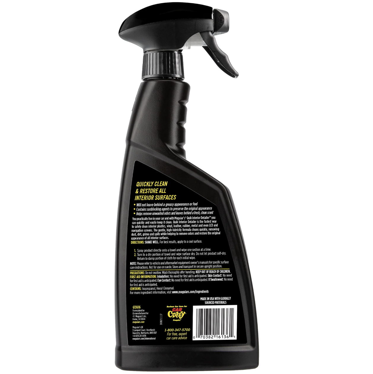 Meguiar’s Quik Interior Detailer je výkonný a zároveň jemný sprej-detailer určený pro čištění interiéru vozidla. Jeho jemná, vysoce lubrikovaná receptura umožňuje bezpečně a efektivně odstranit prach, otisky prstů, mastnotu, nečistoty a skvrny z plastů, vinylu, kůže, gumy, kovu i z dotykových a navigačních obrazovek. Přípravek obsahuje UV blokátory, které pomáhají chránit povrchy před vyblednutím, praskáním a stárnutím vlivem slunečního záření. Po aplikaci zůstávají povrchy svěží a upravené, bez mastného filmu či nežádoucího lesku - interiér tak působí jako právě detailovaný.