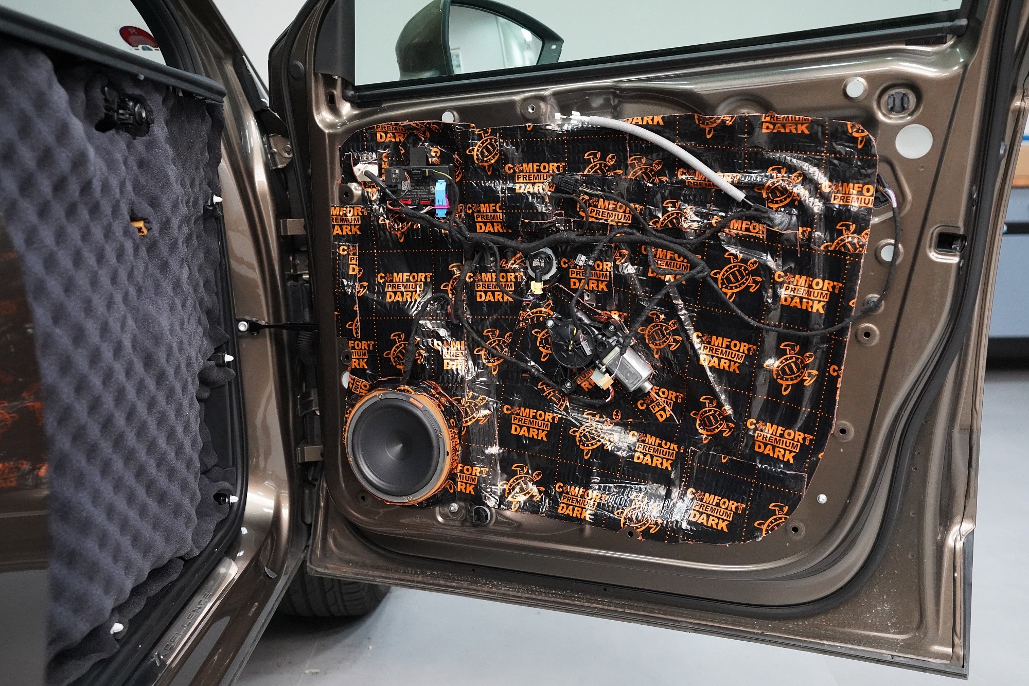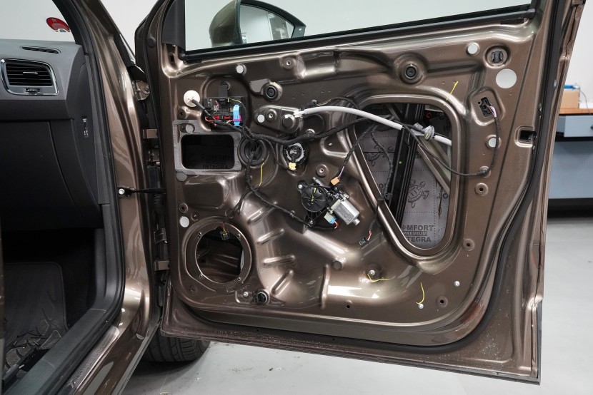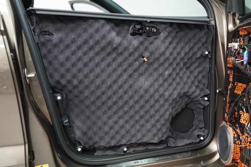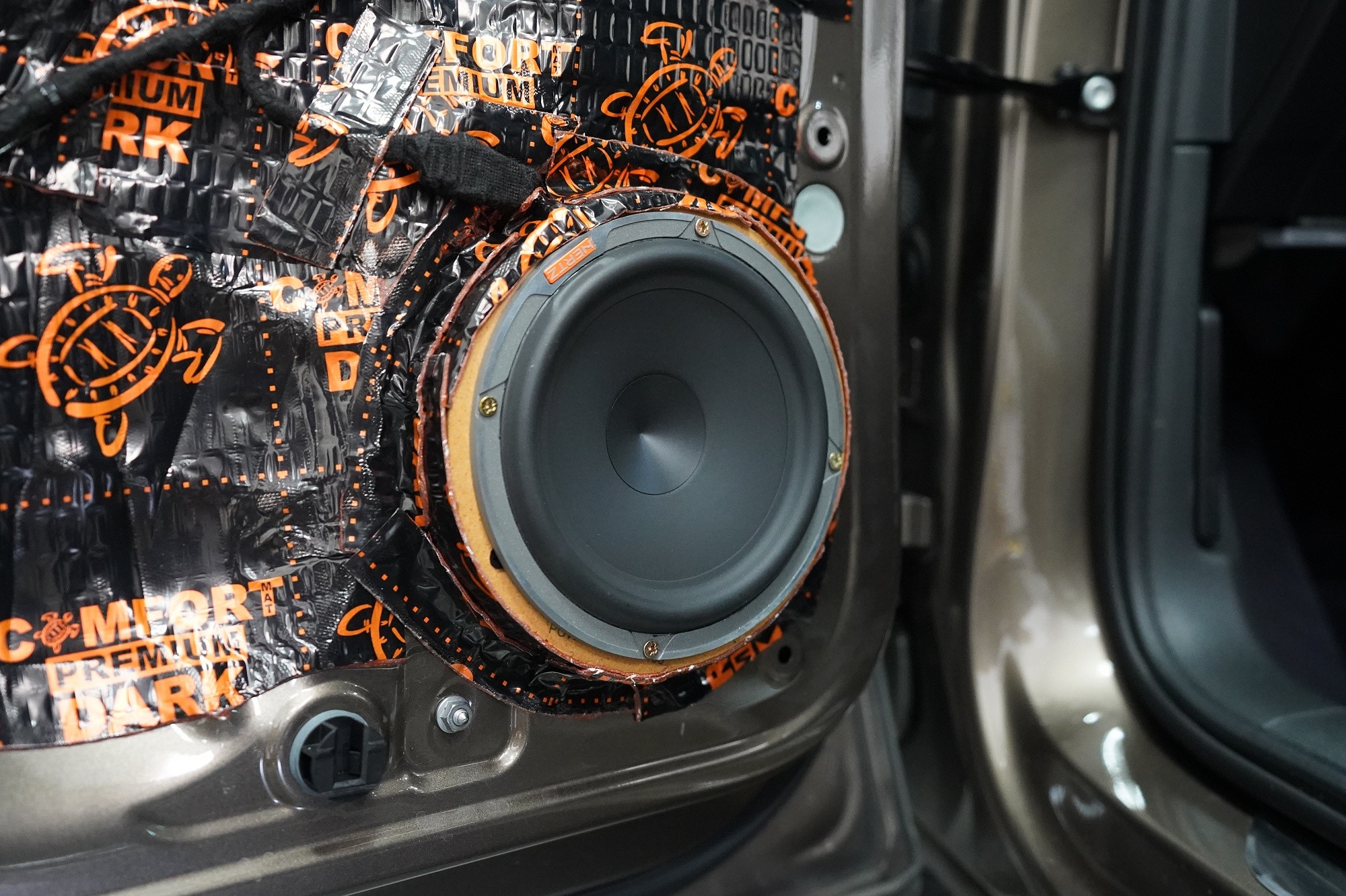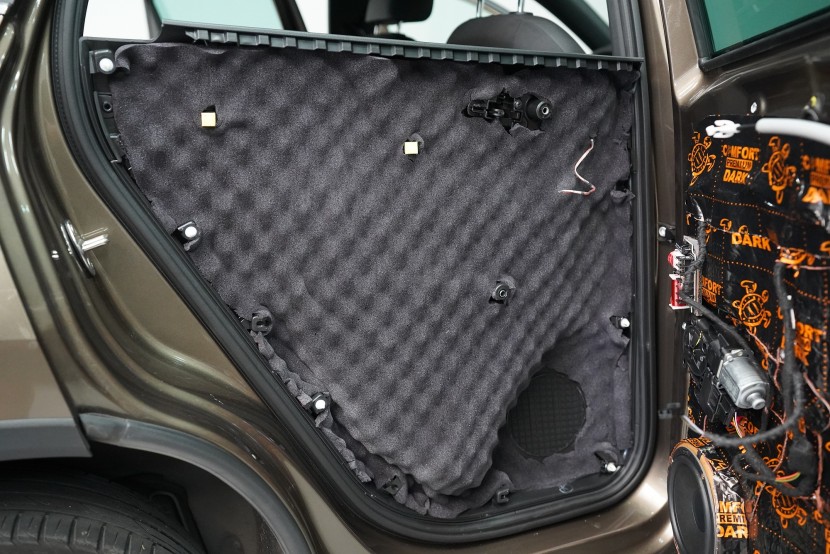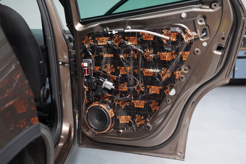 Důležitou součástí instalace je tlumení dveří, které má za následek výrazně zlepšení zvuku středobasových reproduktorů a to zejména jejich basové složky. První vrstvou je antivibrační materiál Comfortmat D2, který vnější plech dveří zpevní a zamezí vibracím. Jedná se o prémiový a velmi lehký materiál, který zbytečně nezatěžuje dveře, je absolutně voděodolný a mimo jiné má i antikorozní vlastnosti.