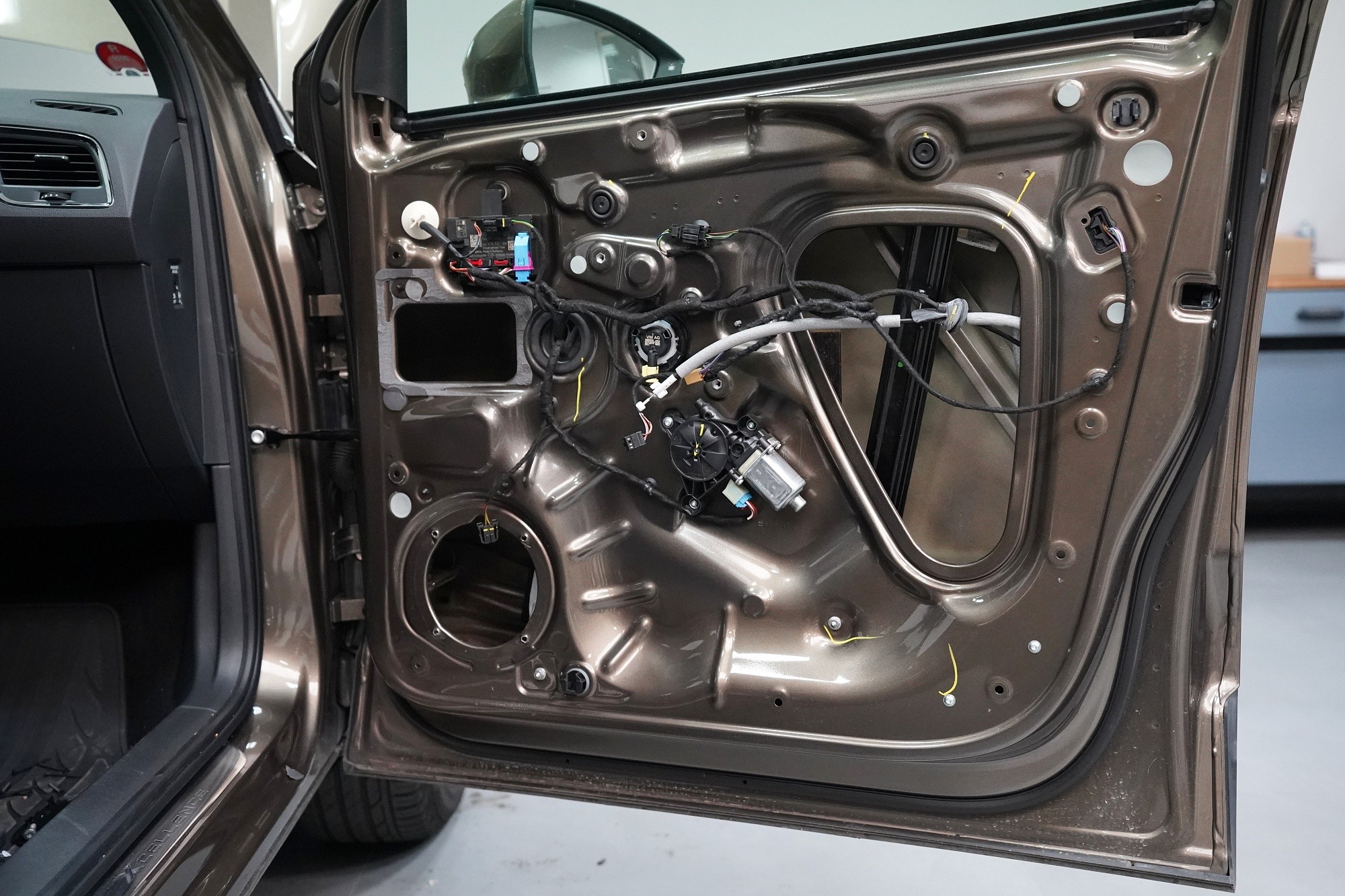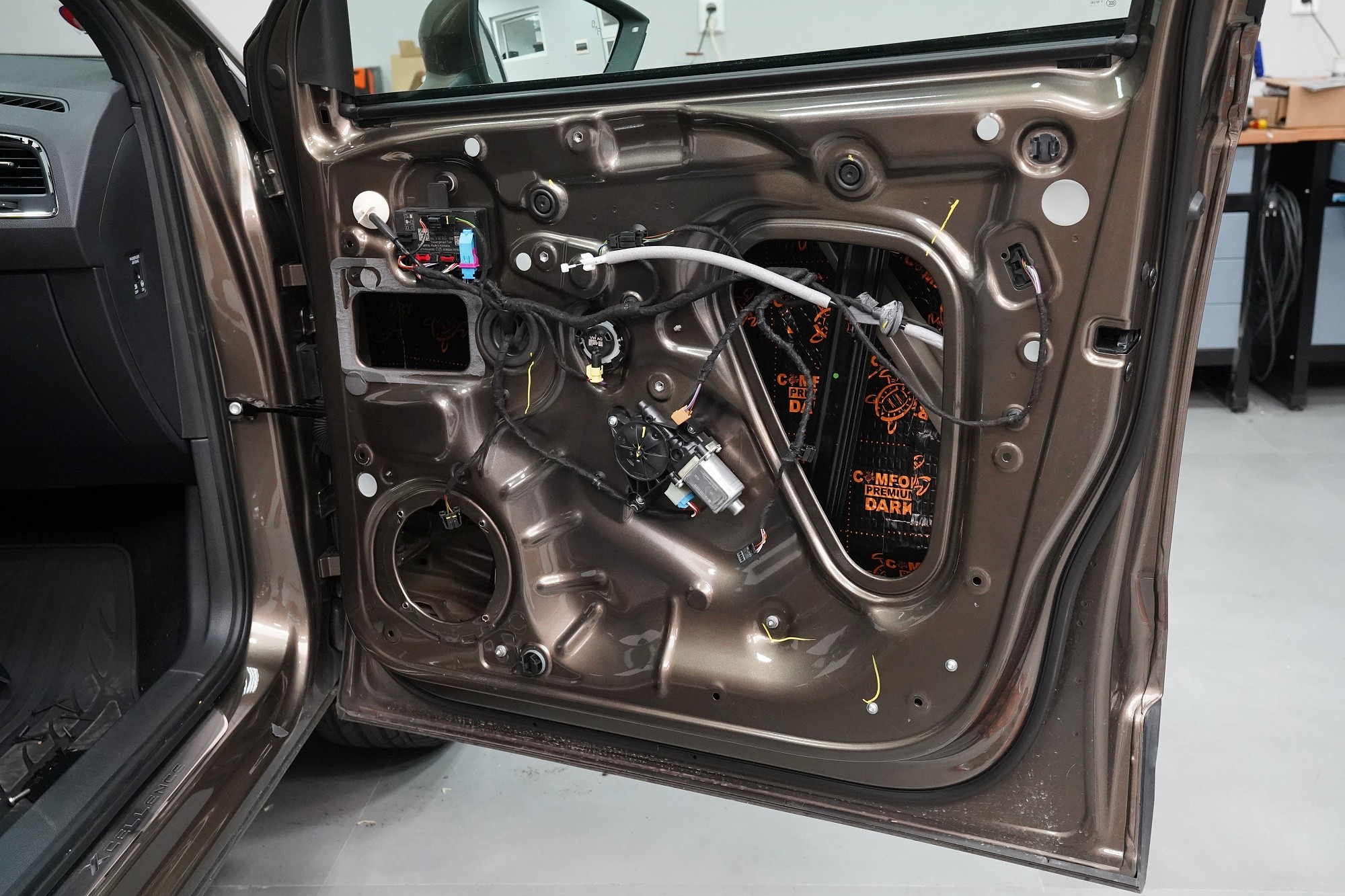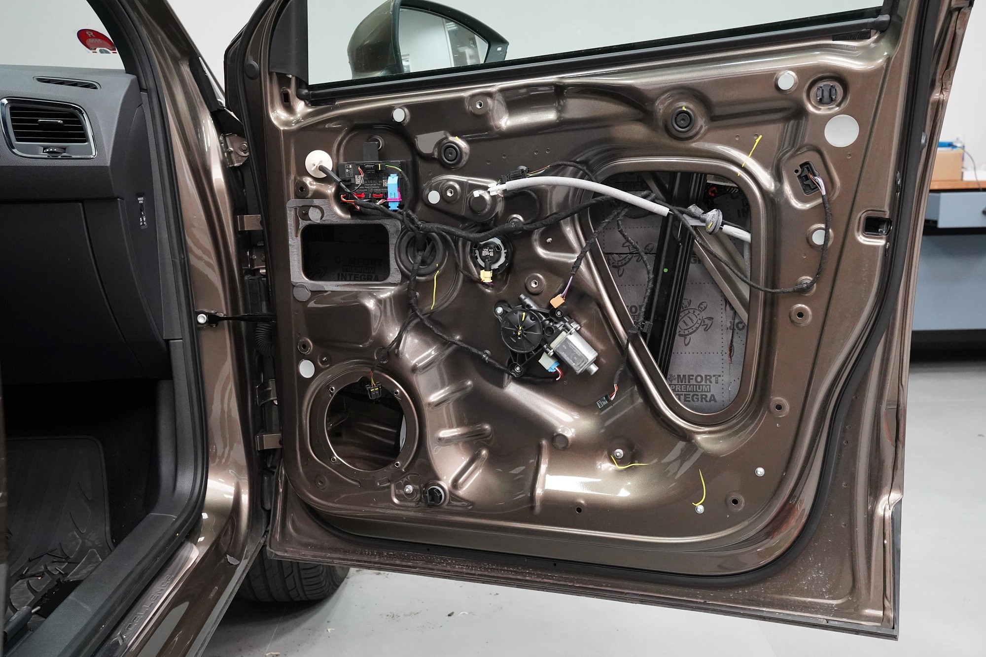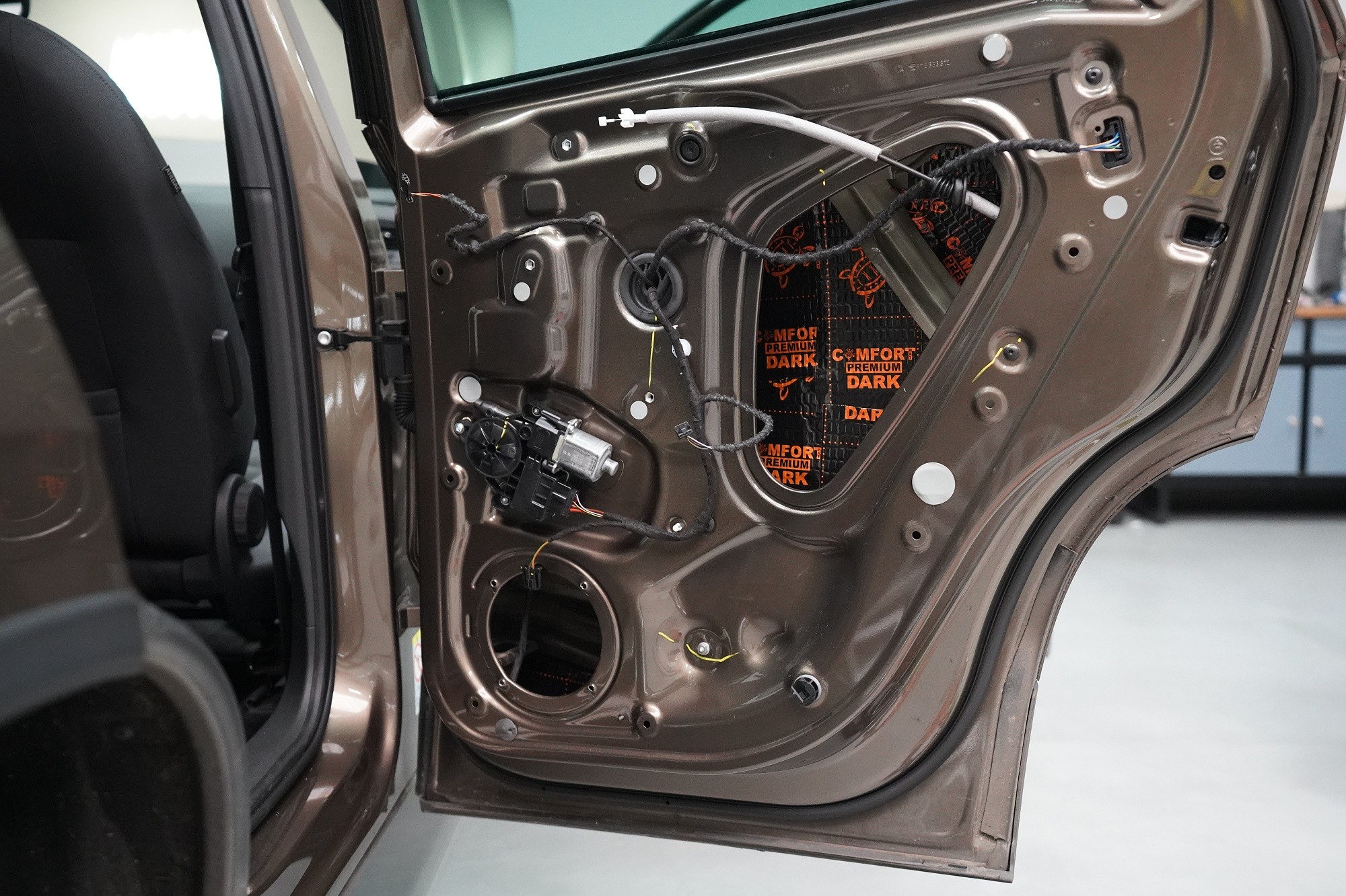 Důležitou součástí instalace je tlumení dveří, které má za následek výrazně zlepšení zvuku středobasových reproduktorů a to zejména jejich basové složky. První vrstvou je antivibrační materiál Comfortmat D2, který vnější plech dveří zpevní a zamezí vibracím. Jedná se o prémiový a velmi lehký materiál, který zbytečně nezatěžuje dveře, je absolutně voděodolný a mimo jiné má i antikorozní vlastnosti.