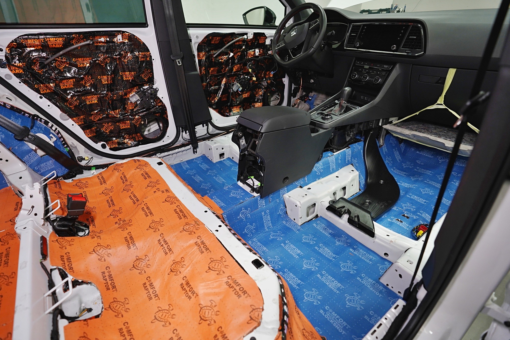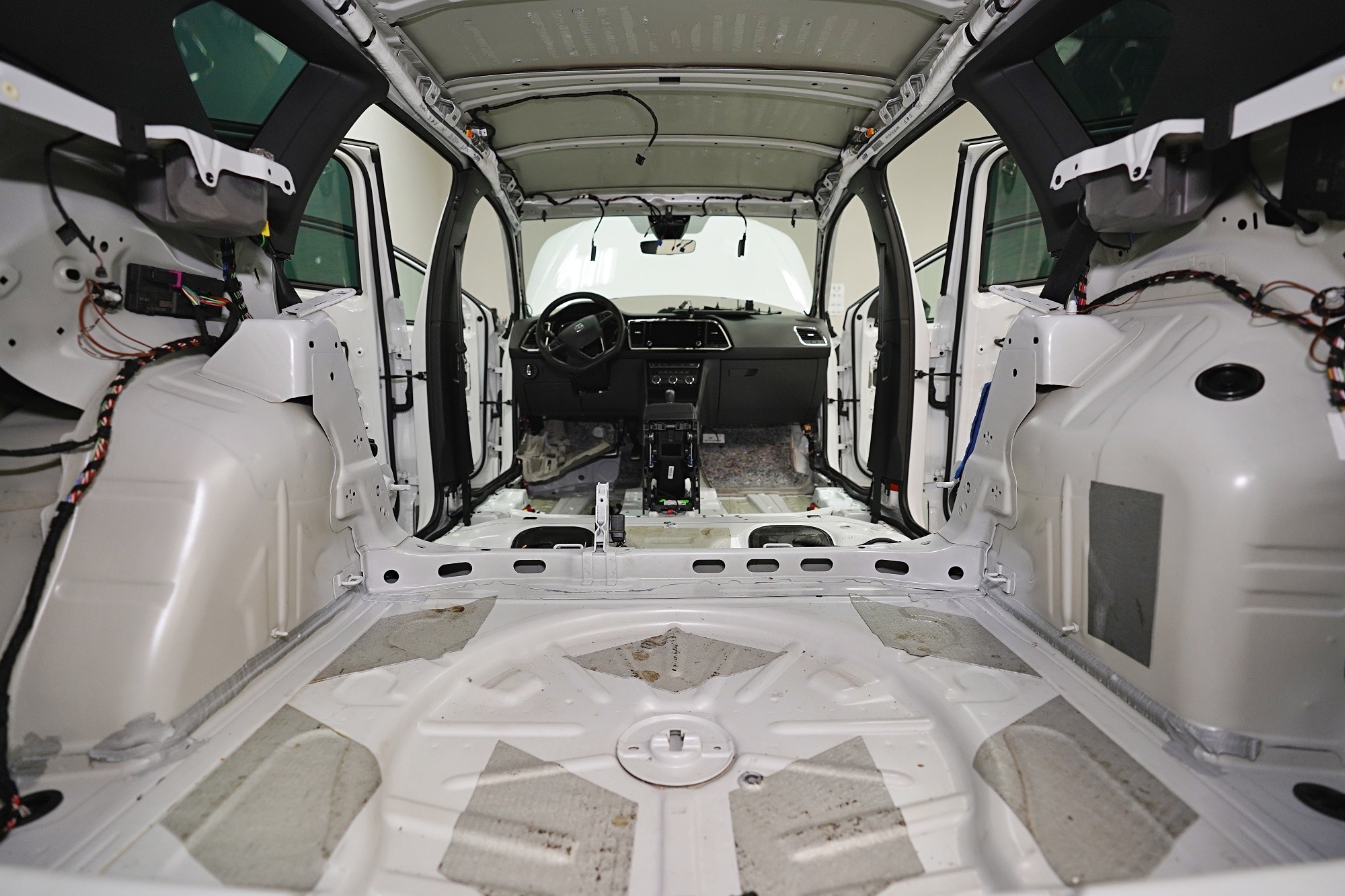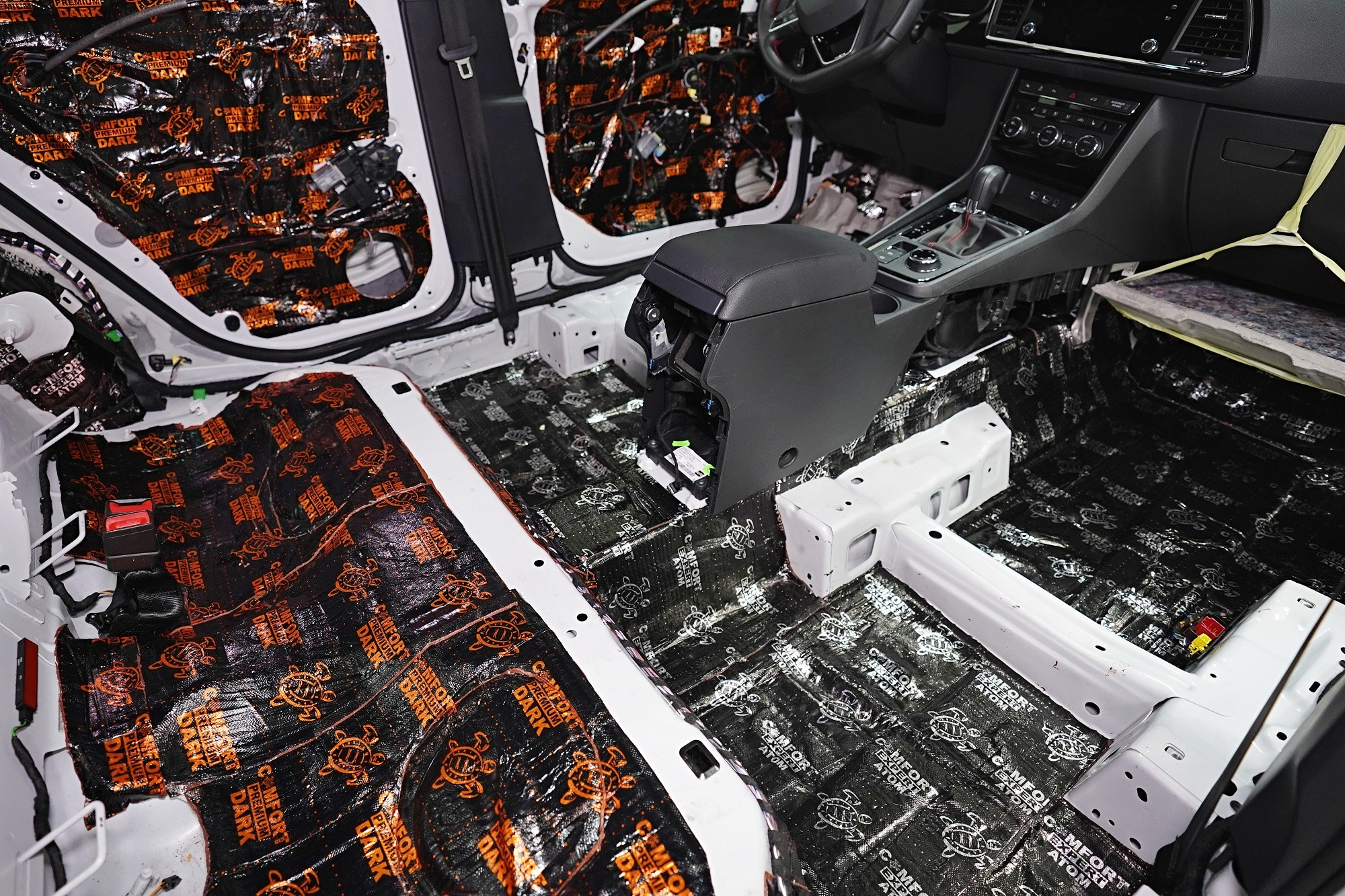 Odhlučnění španělského SUV Seat Ateca ve sportovní verzi FR. Toto dvojče oblíbeného českého ekvivalentu Škoda Karoq je technicky téměř identické, vyrábí se ve stejné fabrice v Kvasinách a kromě přední a zadní části se jedná prakticky totožné vozidlo. Za nás je Ateca designově povedenější a motor 2,0 TSI s výkonem 140 kw v kombinaci se sedmistupňovou automatikou určitě zajímavější volbou. Osobní sympatie však nechme stranou a podívejme se na tovární zvukovou izolaci. Ta je zcela totožná jako u Škody Karoq, jinými slovy na velmi nízké úrovni. Holé plechy s bodovou ochranou proti vibracím a zvuková izolaci přítomna pouze ve formě gumy v přední části podlahy. S rostoucí rychlostí se začíná projevovat hluk od předních i zadních pneumatik, hluk od motoru a převodovky i okolní silniční a aerodynamický hluk. Řešením je komplexní zvuková izolace špičkovými materiály Comfortmat a to v našem balíčku odhlučnění Expert. Ten zahrnuje odhlučnění všech důležitých části vozu, konkrétně předních, zadních, i pátých dveří, podlahy, střechy, zavazadlového prostoru, kapoty, torpéda a předních i zadních podběhů z vnitřní strany. Na odhlučnění pracují zároveň čtyři naši zkušení technici, kteří montáž zvládnou v rámci 1 dne.