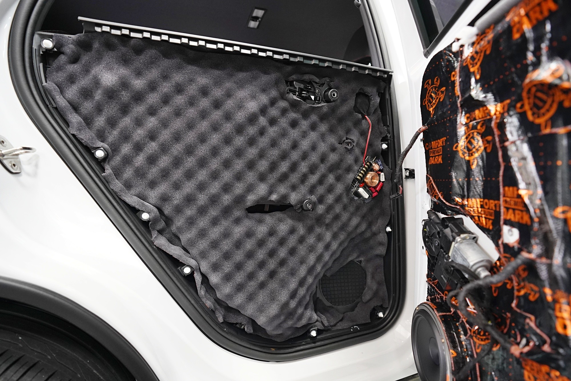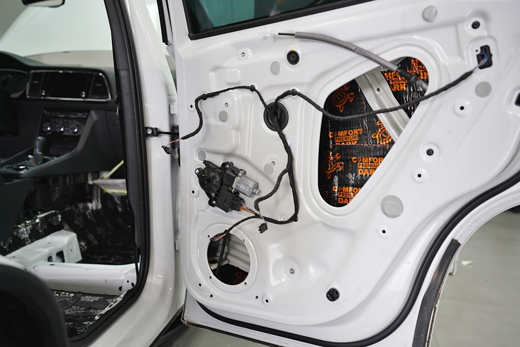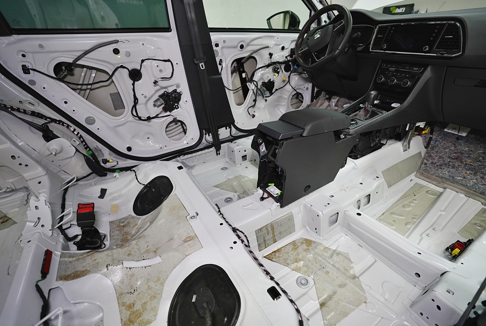 Odhlučnění španělského SUV Seat Ateca ve sportovní verzi FR. Toto dvojče oblíbeného českého ekvivalentu Škoda Karoq je technicky téměř identické, vyrábí se ve stejné fabrice v Kvasinách a kromě přední a zadní části se jedná prakticky totožné vozidlo. Za nás je Ateca designově povedenější a motor 2,0 TSI s výkonem 140 kw v kombinaci se sedmistupňovou automatikou určitě zajímavější volbou. Osobní sympatie však nechme stranou a podívejme se na tovární zvukovou izolaci. Ta je zcela totožná jako u Škody Karoq, jinými slovy na velmi nízké úrovni. Holé plechy s bodovou ochranou proti vibracím a zvuková izolaci přítomna pouze ve formě gumy v přední části podlahy. S rostoucí rychlostí se začíná projevovat hluk od předních i zadních pneumatik, hluk od motoru a převodovky i okolní silniční a aerodynamický hluk. Řešením je komplexní zvuková izolace špičkovými materiály Comfortmat a to v našem balíčku odhlučnění Expert. Ten zahrnuje odhlučnění všech důležitých části vozu, konkrétně předních, zadních, i pátých dveří, podlahy, střechy, zavazadlového prostoru, kapoty, torpéda a předních i zadních podběhů z vnitřní strany. Na odhlučnění pracují zároveň čtyři naši zkušení technici, kteří montáž zvládnou v rámci 1 dne.