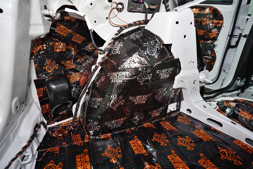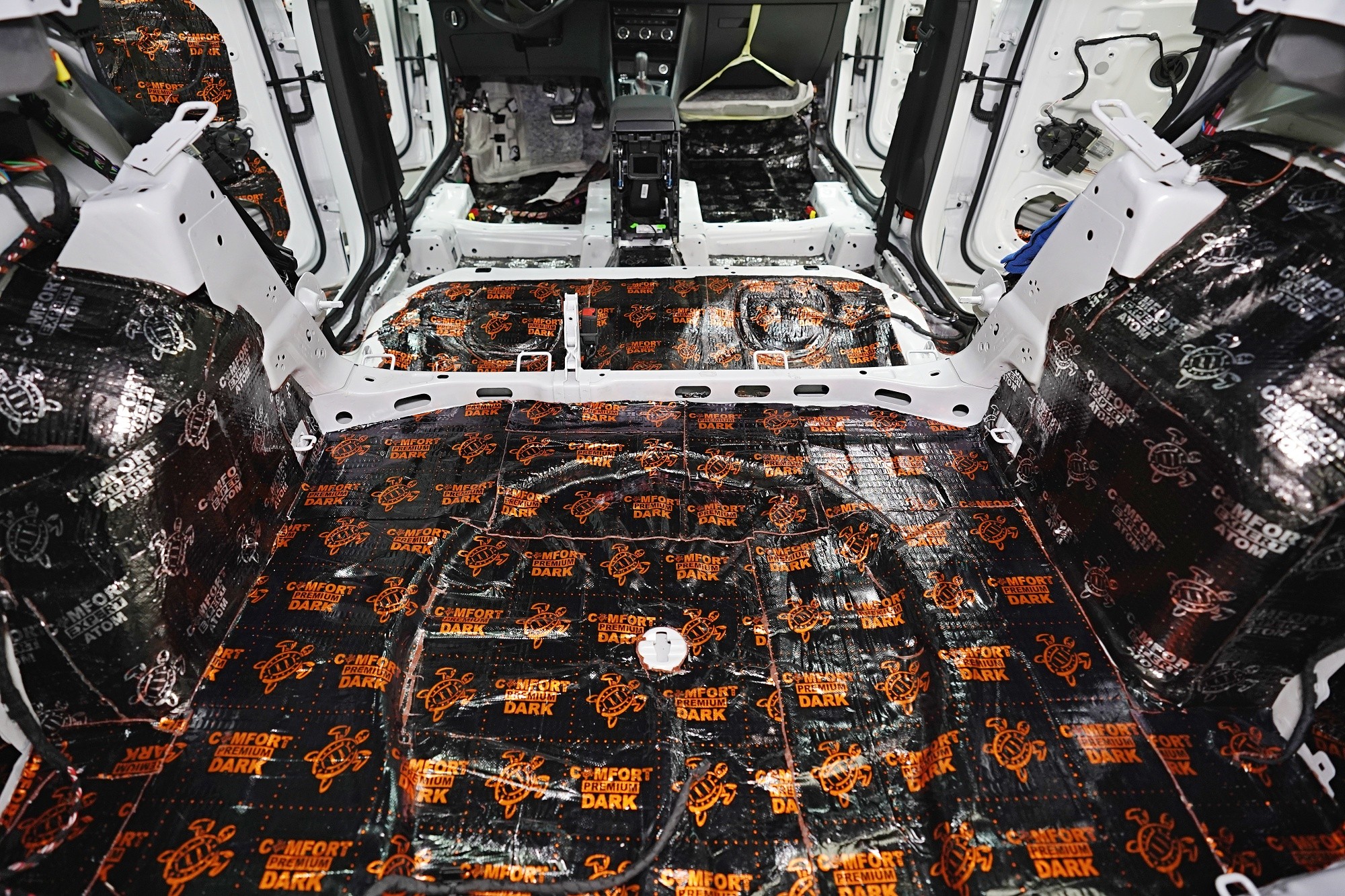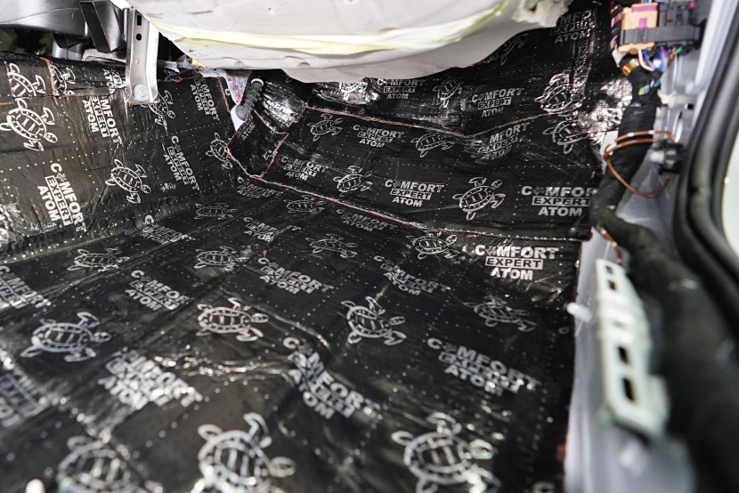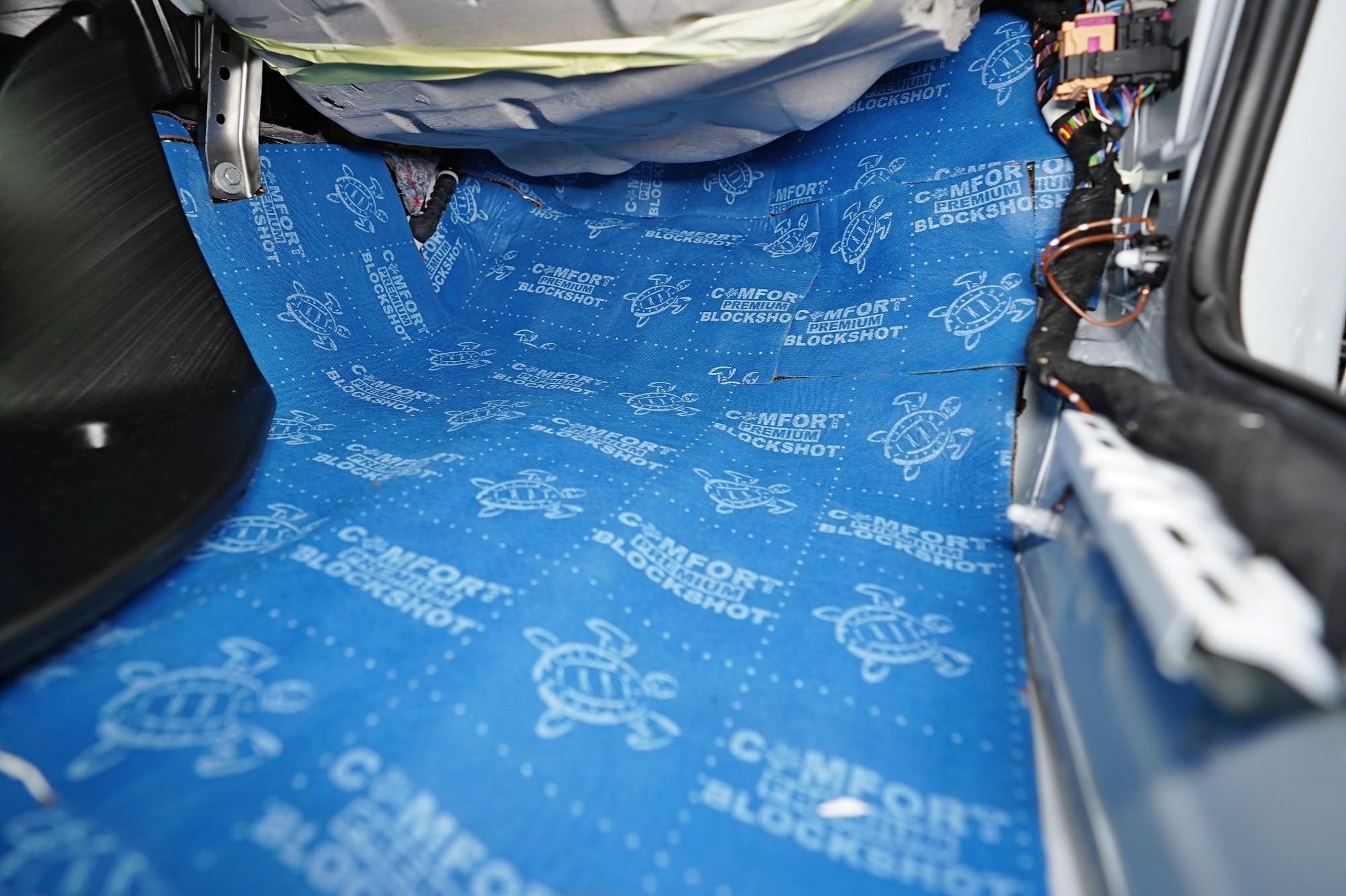 Začínáme podlahou, jejíž odhlučnění je kvůli enormním vibracím i výraznému nízkofrekvenčnímu hluku zásadní pro celkové odhlučnění vozu. Jako první vrstvu aplikujeme špičkový antivibrační materiál Comfortmat Atom z nejvyšší řady Expert, který je určený zejména pro profesionální instalační centra. Materiál je složený ze dvou vrstev s celkovou tloušťkou 4 mm a s akustickým ztrátovým činitelem (MLF) o extrémní hodnotě 0,60 jednotek. To umožní excelentní zamezení vibrací i výrazné snížení nízkofrekvenčního hluku.