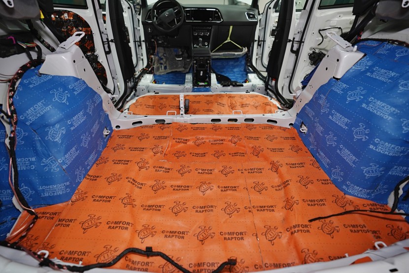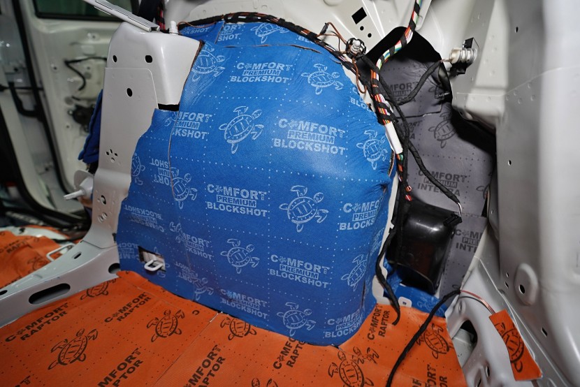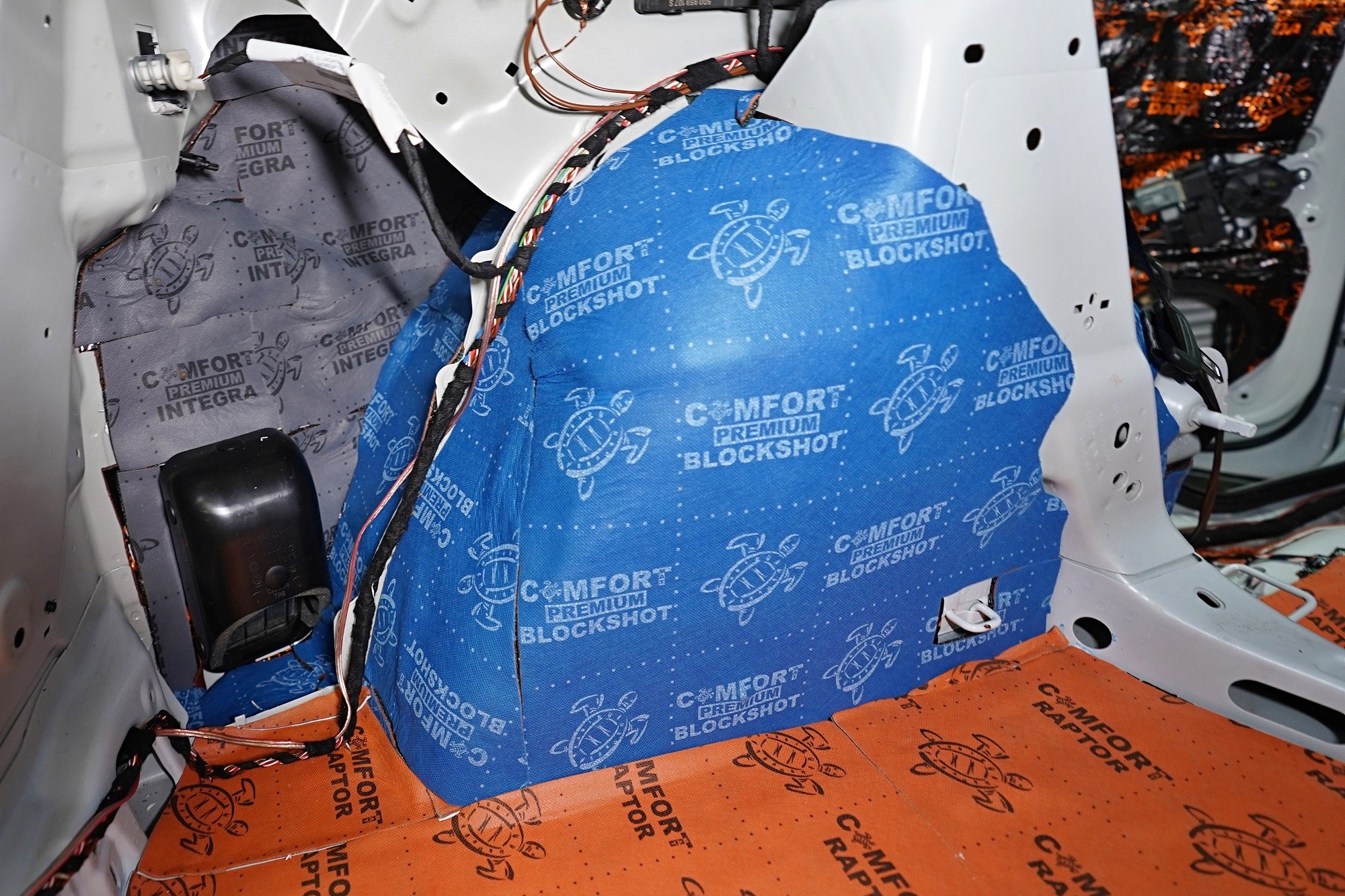 Druhou vrstvu na podlaze u balíčku Expert tvoří membránový materiál Comfortmat Blockshot, který při tloušťce 7 mm vyniká vysokou schopností zvukové izolace až 32 dB. Je to díky jeho vícevrstvému složení s 2 mm silnou protihlukovou membránou, která umožní takto vysokou účinnost. Blockshot nahrazuje dvě vrstvy odhlučnění a odfiltruje hluk od vozovky, pneumatik, ale i převodovky a zavěšení kol. Na prostor pod zadními sedačkami aplikujeme tenký membránový materiál Comfortmat Raptor o tloušťce pouhých 4 mm, přitom účinností až 30 dB!