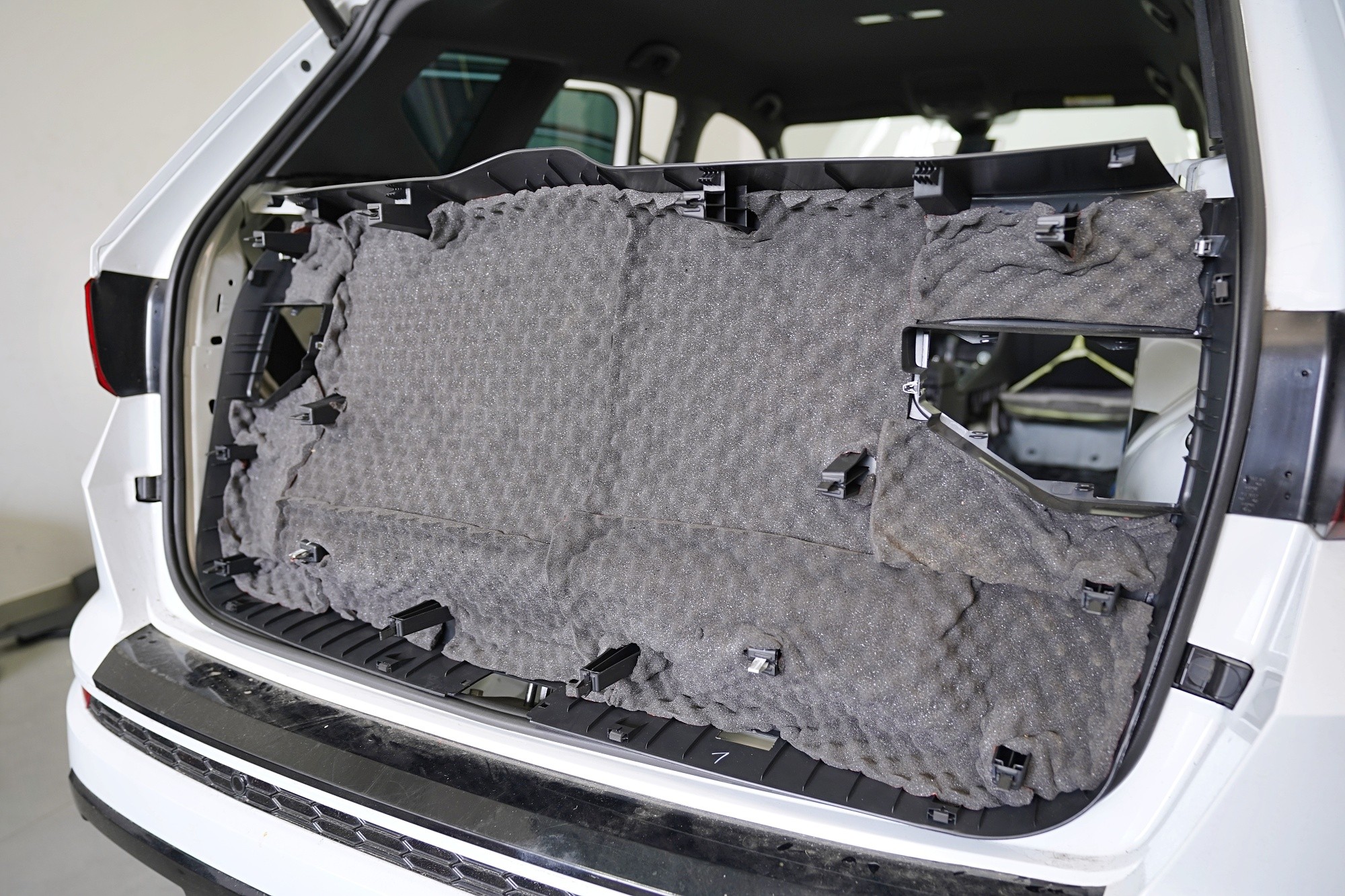Podobným způsobem odhlučňujeme zavazadlový prostor. I dno kufru je velmi zatěžováno vibracemi a hlukem a musíme tedy volit odpovídající materiály. Na dno kufru aplikujeme stejný materiál jako pod zadní sedačky, tedy Comfortmat Dark D3 o tloušťce 3 mm a MLF 0,41. Ten nejen absorbuje veškeré vibrace, ale sníží i nízkofrekvenční hluk, který je typický pro tuto oblast.