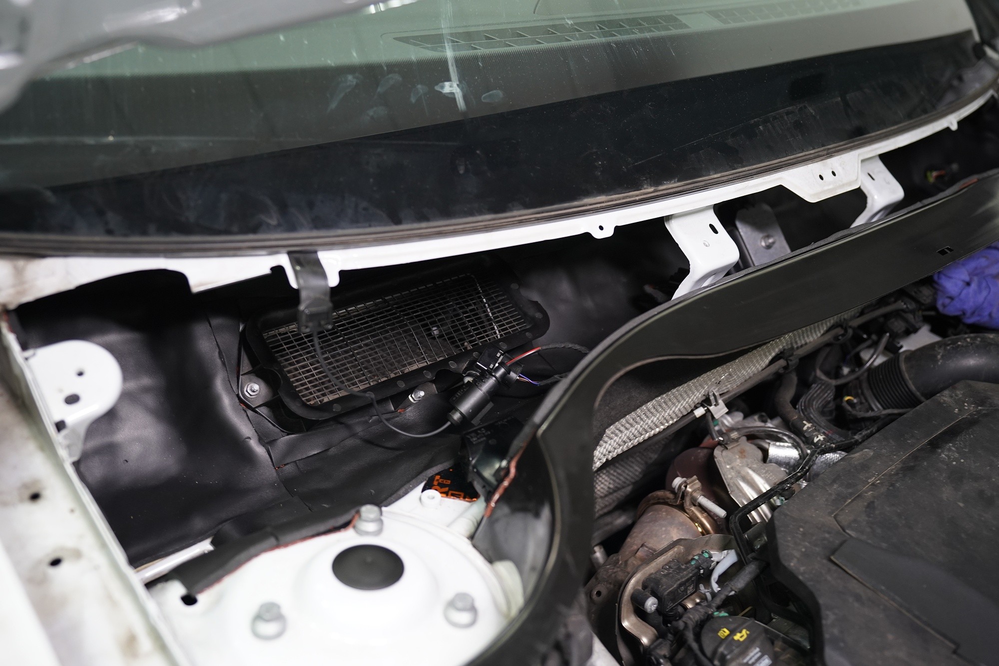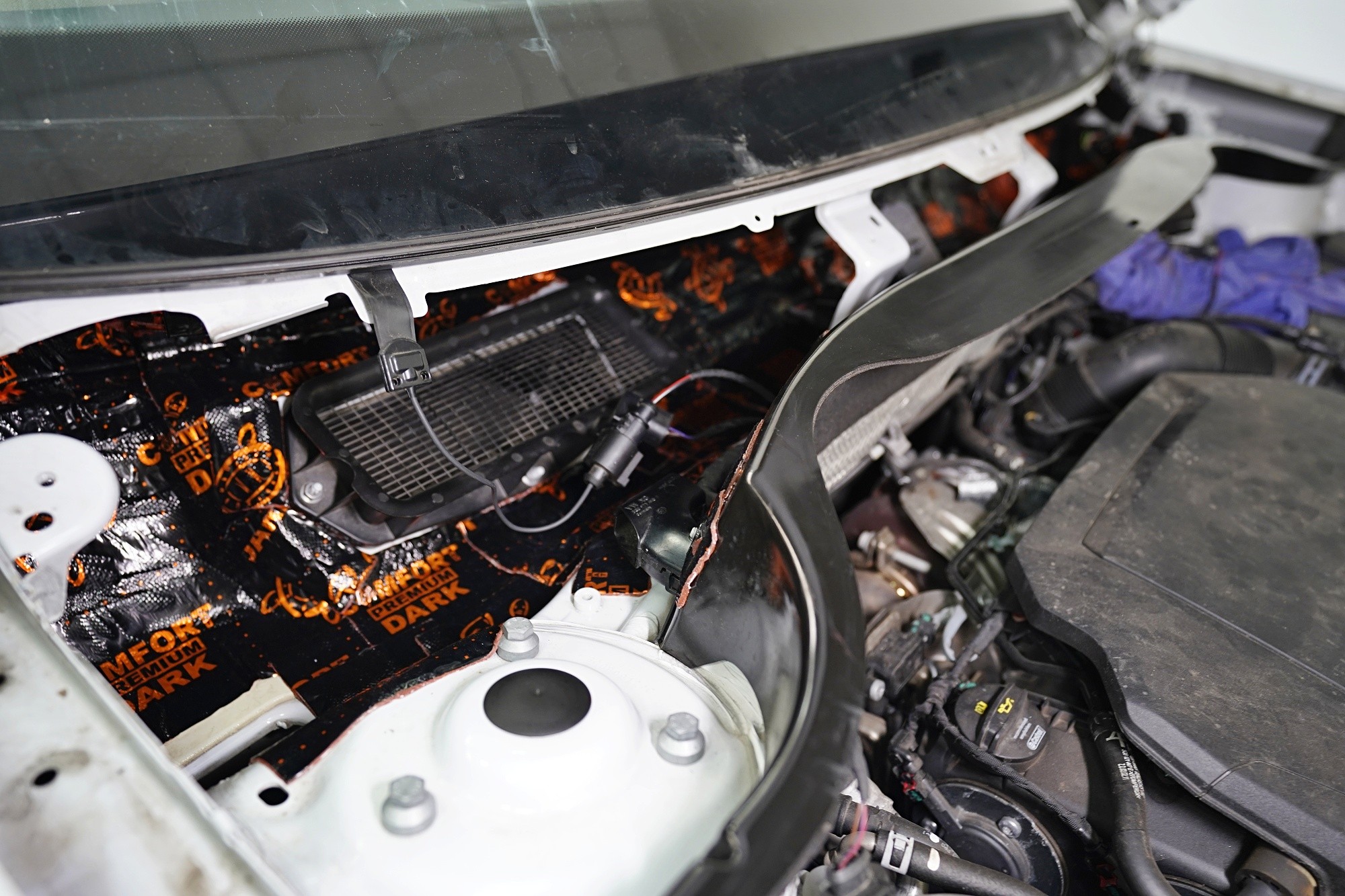 Také odhlučnění torpéda může přinést zajímavé výsledky. Stěrače jsou zdrojem silných vzduchových turbulencí a prostor pod spodním okrajem čelního skla je často veliký. Vytváří se zde efekt zvuku v jeskyni a to v bezprostřední blízkosti interiéru. Druhým důvodem k odhlučnění torpéda je snížení hluku od motoru. Nejprve tradičně aplikujeme antivibrační materiál, konkrétně Comfortmat Dark D3, který odfiltruje silné vibrace motoru.