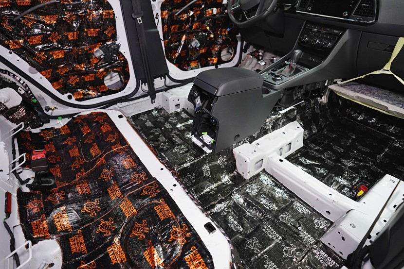 Atom aplikujeme na všechna dostupná místa, abychom umožnili izolaci maximálního množství vibrací a nízkofrekvenčního hluku. V přední části podlahy se dostáváme až pod palubní desku, díky čemuž důkladně odhlučníme i přední podběhy z vnitřní části vozu, kde je přístup k větší ploše karoserie. Podlahu odhlučňujeme vysoce účinným antivibračním materiálem o tloušťce 4 mm a zvukově izolačním materiálem v druhé vrstvě o tloušťce 7 mm. Celkem tedy 11 mm zvukové izolace, což má za následek důkladné zamezení hluku od předních pneumatik i bez aplikace z vnější strany.