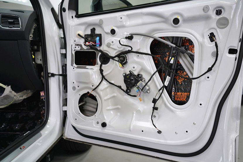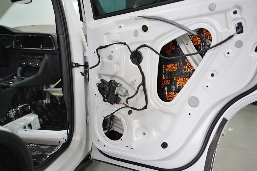 Poslední vrstvou je Comfortmat Softwave o tloušťce 15 mm. Tato flexibilní pěna s tvarovou pamětí se lepí na plastové čalounění dveří z důvodu zamezení skřípání a vrzání nejen plastů, ale i drátů a dalších komponent uvnitř dveří a dodatečně i sníží hluk této oblasti.
