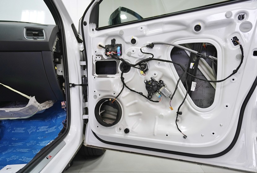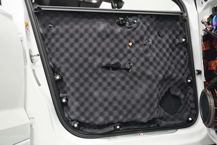 Zadní podběhy opatříme stejným zvukově izolačním materiálem, jaký jsme použili i na odhlučnění podlahy, konkrétně tedy membránovým materiálem Comfortmat Blockshot. Blockshot se vyznačuje při své tloušťce 7 mm vysokou schopností zvukové izolace až 32 dB, což je již velmi solidní hodnota pro odhlučnění této vibracemi i hlukem velmi zatížené oblasti. Nezapomínáme ani na blatníky, na které aplikujeme lehký membránový materiál Comfortmat Integra s účinností 28 dB a velmi nízkou hmotností. Tento materiál využíváme i při odhlučnění dveří.