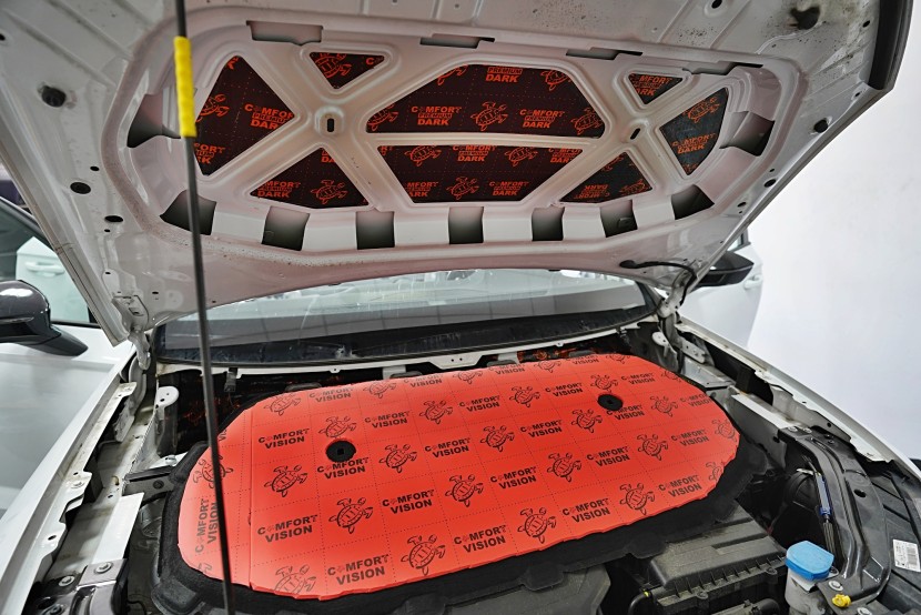 Nezapomínáme ani na kapotu, na kterou v první vrstvě aplikujeme opět lehký antivibrační materiál Comfortmat D2. Tím kapotu zpevníme, zamezíme vibracím, které se přenáší do dalších částí vozu a zmizí i typický plechový zvuk při zavření kapoty. Na originální kryt kapoty následně aplikujeme zvukově i tepelně izolační materiál Comfortmat Vision, který sníží hluk motoru a to při zachování původního vzhledu motorového prostoru.