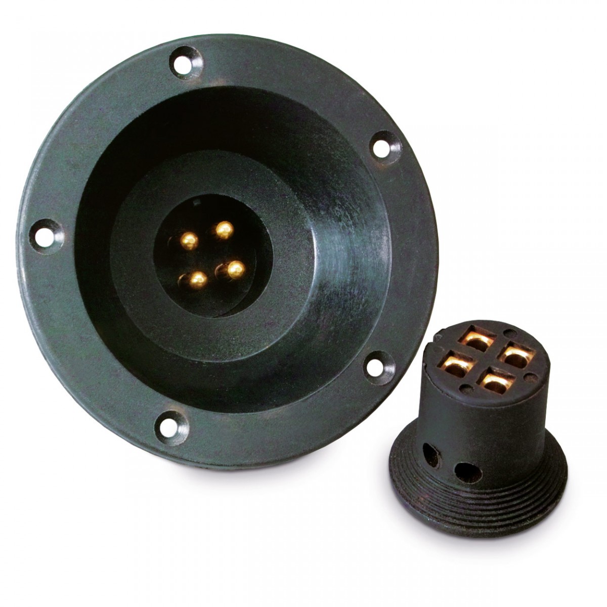 Polaritou chráněný reproduktorový konektor + zapuštěná namontovaná zásuvka se čtyřmi porty. Vhodné pro basové reproduktory s dvojitou kmitací cívkou nebo bi-amp.