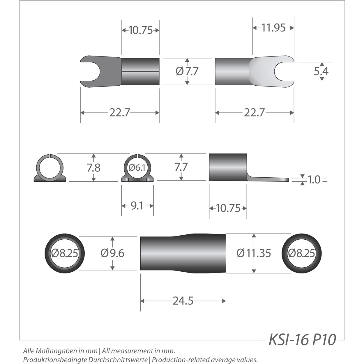 Kabelové vidličky na kabel o průřezu 16 mm². V balení najdete 10 kusů (5 červených a 5 černých bužírek). Lze je pájet nebo klasicky stlačit kleštěmi. Vnitřní rozteč vidličky je 5,45 mm, vnější 9,05 mm.