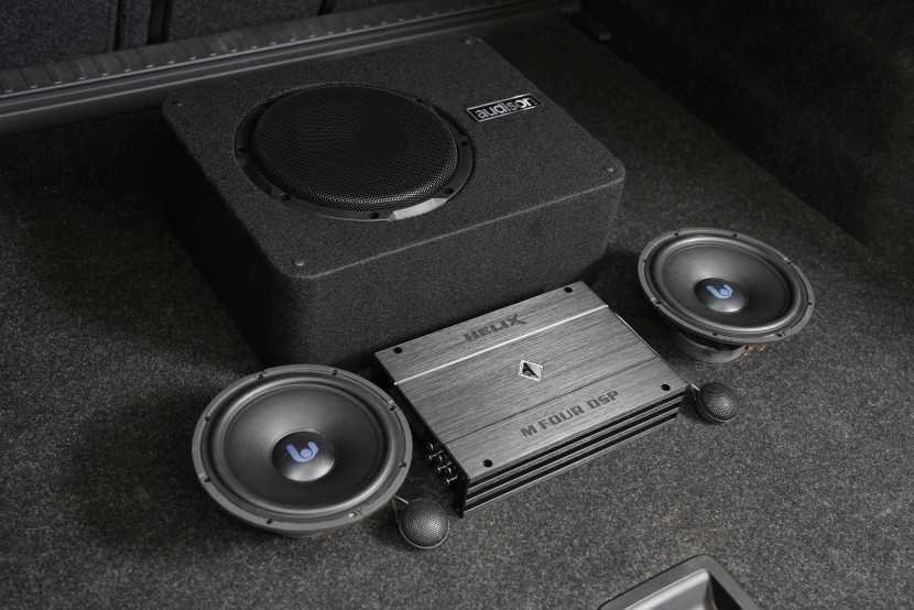 Zesilovač Helix jsme umístili do skrytého prostoru ve dně zavazadlového prostoru. Slouží k napájení nových reproduktorů Quartorigo a zároveň nám poslouží k detailnímu nastavení zvuku, díky integrovanému DSP procesoru. Koncepce třídy D se perfektně hodí nejen pro daný elektromobil, ale i do těchto skrytých prostor.