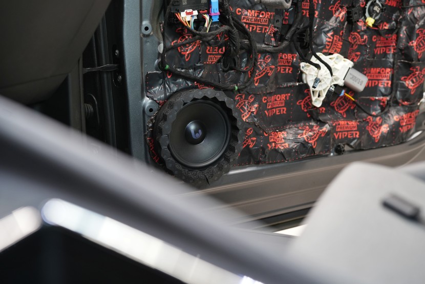 Na fotografii je zobrazen středobasový reproduktor Quartorigo a také poslední vrstva odhlučnění dveří, konkrétně antivibrační materiál Comfoertmat Viper, který slouží k zamezení vibrací vnitřního plechu dveří a u většiny vozidel i k vytvoření uzavřené ozvučnice pro reproduktory, díky čemuž zejména basová složka středobasového reproduktoru dozná podstatného zlepšení.