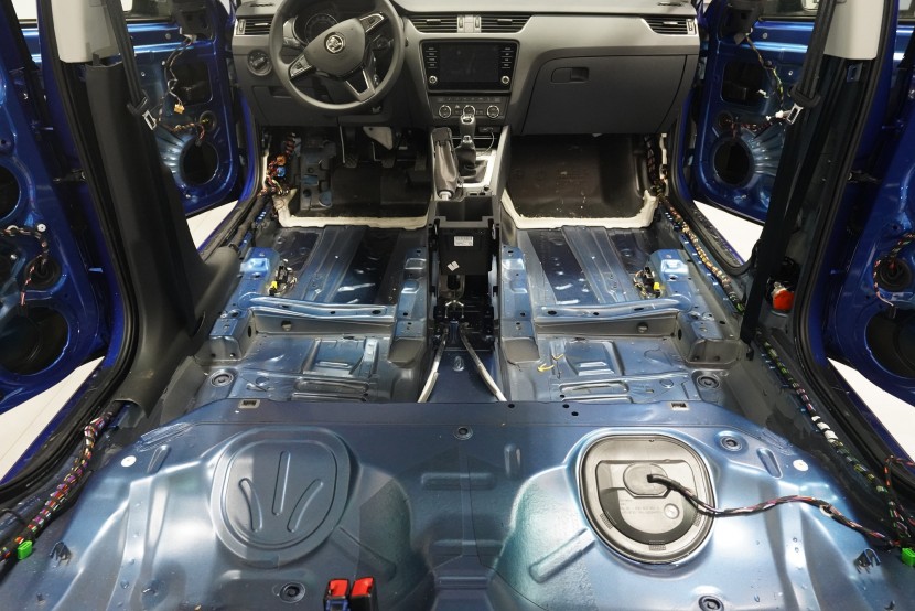 Dark D4 spolu s druhou vrstvou aplikujeme na všechny přístupné oblasti, abychom umožnili izolaci maximálního množství vibrací a hluku. V přední části podlahy se dostáváme až pod palubní desku, díky čemuž důkladně odhlučníme i přední podběhy z vnitřní části vozu, kde je přístup k větší ploše karoserie. Podlahu odhlučňujeme vysoce účinným antivibračním materiálem o tloušťce 4 mm a zvukově izolačním materiálem v druhé vrstvě o tloušťce 7 mm. Celkem tedy 11 mm zvukové izolace, což má za následek důkladné zamezení hluku od předních pneumatik i bez aplikace z vnější strany.