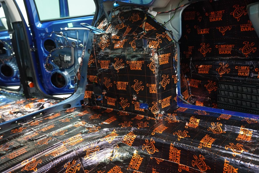 Zavazadlový prostor odhlučňujeme se stejnou pečlivostí. Na dno aplikujeme antivibrační materiál Comfortmat Dark D3 o tloušťce 3 mm a MLF 0,41 jednotek. Na podběhy pak lepíme účinnější materiál Dark D4 s tloušťkou 4 mm a vyšším MLF o hodnotě 0,49 jednotek. Takový materiál již dokáže velmi účinně zamezit vibracím a nízkofrekvenčnímu hluku, který je typický zejména u pneumatik. A nakonec blatníky opatříme nejtenčím materiálem ze série Dark, konkrétně D2 o tloušťce 2,3 mm.