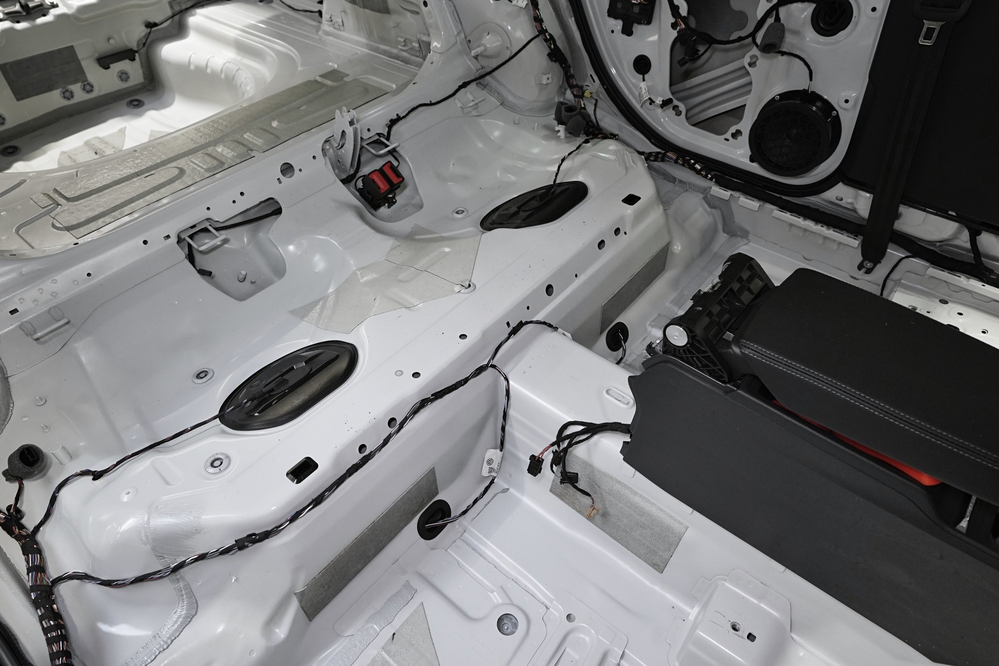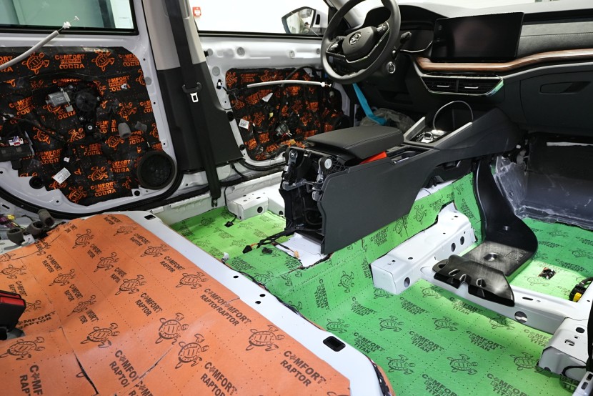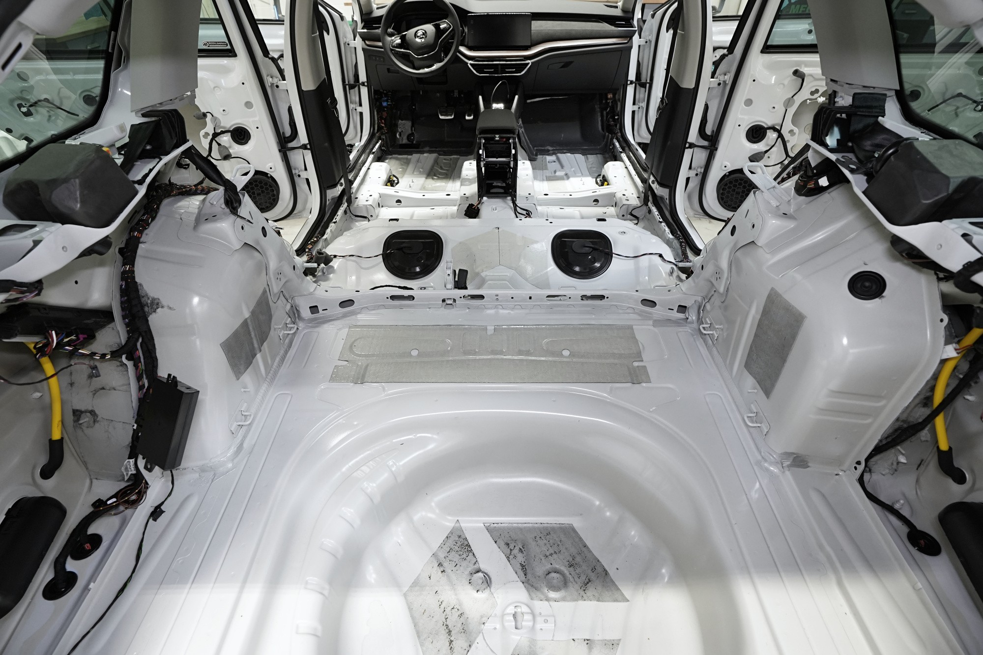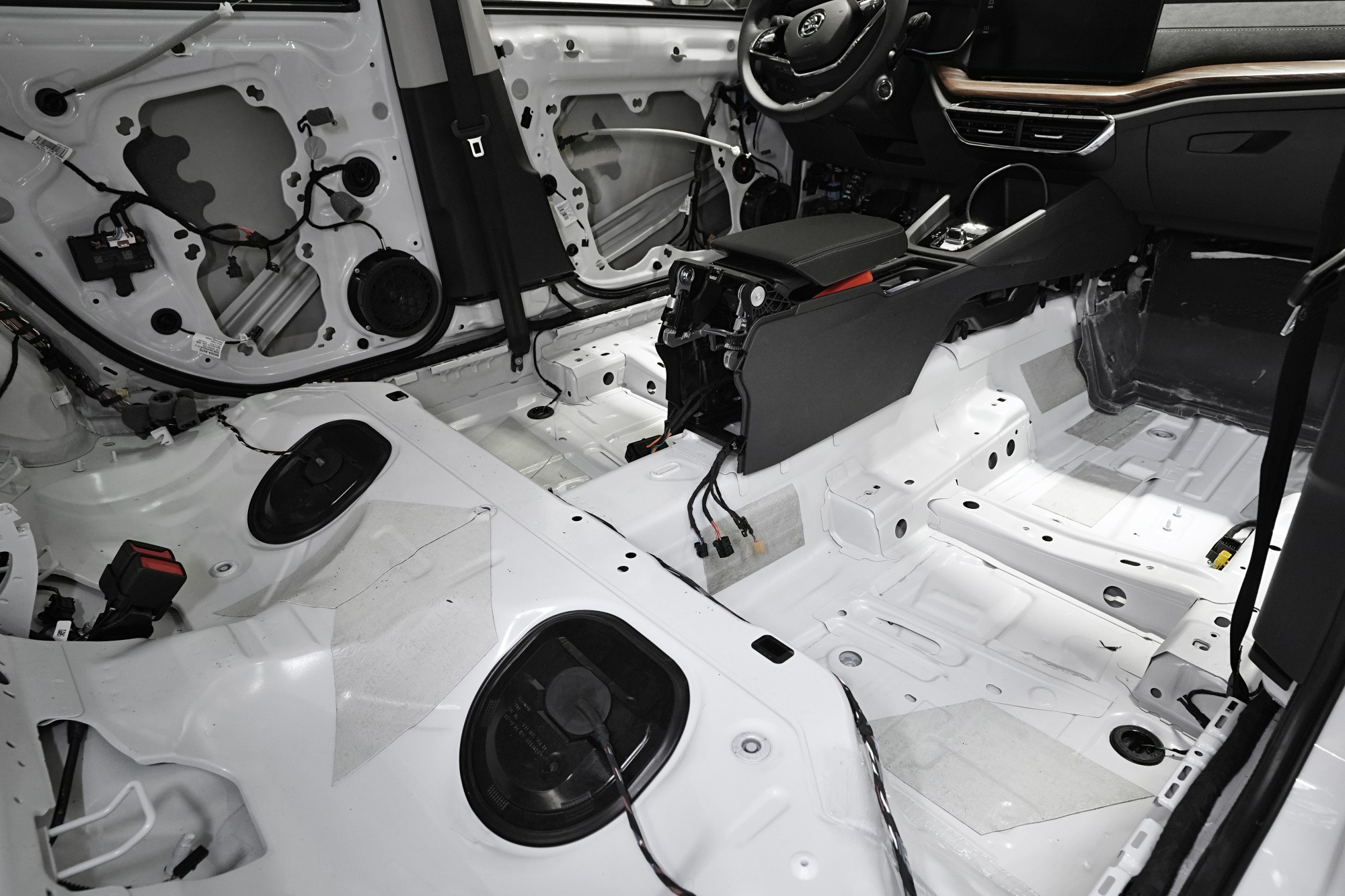 Odhlučnění vozu Škoda Octavia 4 začínáme obvyklým způsobem, tedy demontáží interiéru. Odstraníme všechny sedadla, veškeré čalounění a další komponenty, které nám mohou bránit při práci. Jak sami můžete vidět, plechy jsou až na bodovou aplikaci ochrany proti vibracím prakticky holé. Pouštíme se tedy do práce.