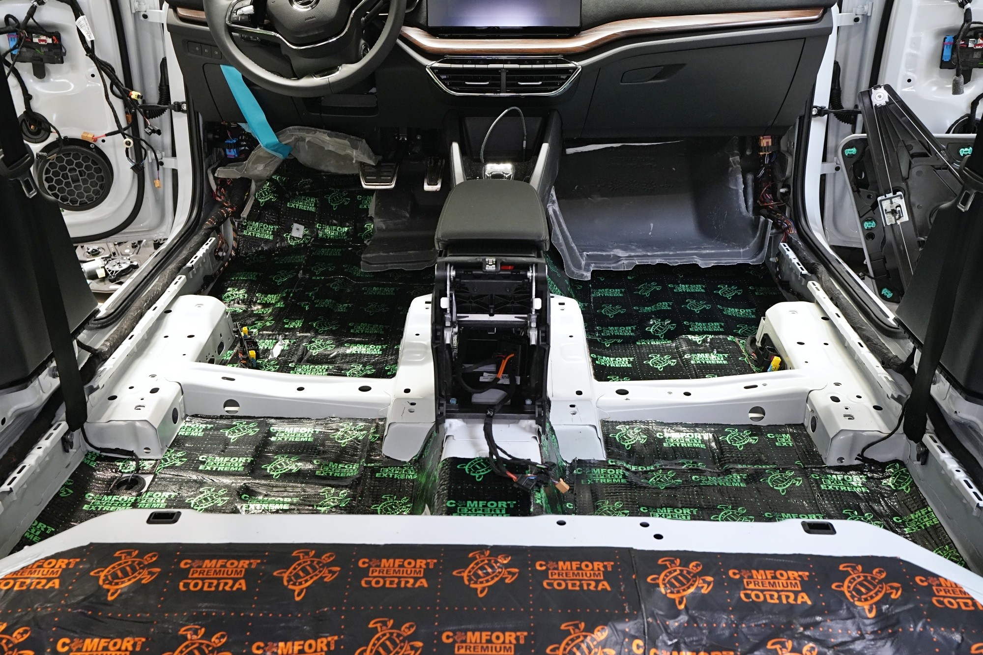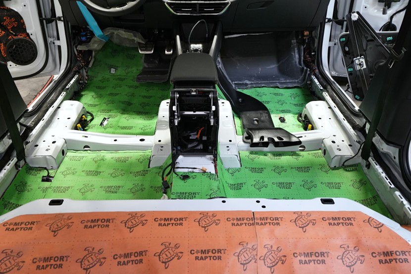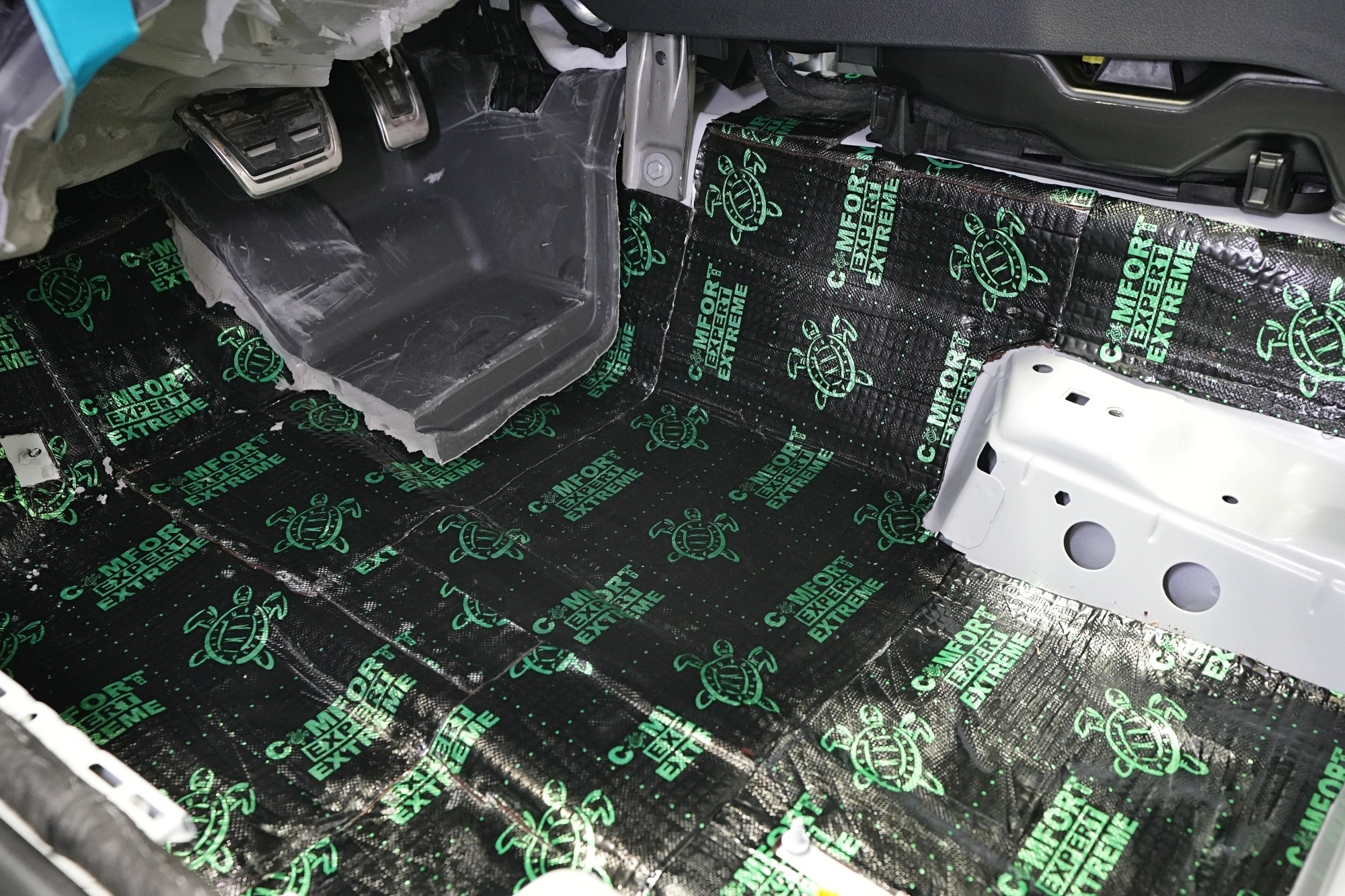 K celkovému odhlučnění vozidla nejvíce přispívá důkladné odhlučnění podlahy, která je kvůli výrazným vibracím a hluku zejména o nízkých frekvencích nejvíce náročná na použití správných materiálů. I proto u balíčku Expert Plus používáme profesionální antivibrační materiál Comfortmat Extreme, který při své tloušťce pouhých 3,5 mm poskytuje akustický ztrátový činitel (MLF) 0,63 jednotek. To z něj dělá nejúčinnější antivibrační materiál na trhu o tloušťce do 4 mm a perfektně se tedy hodí do našich instalací zaměřených na maximální účinnost.