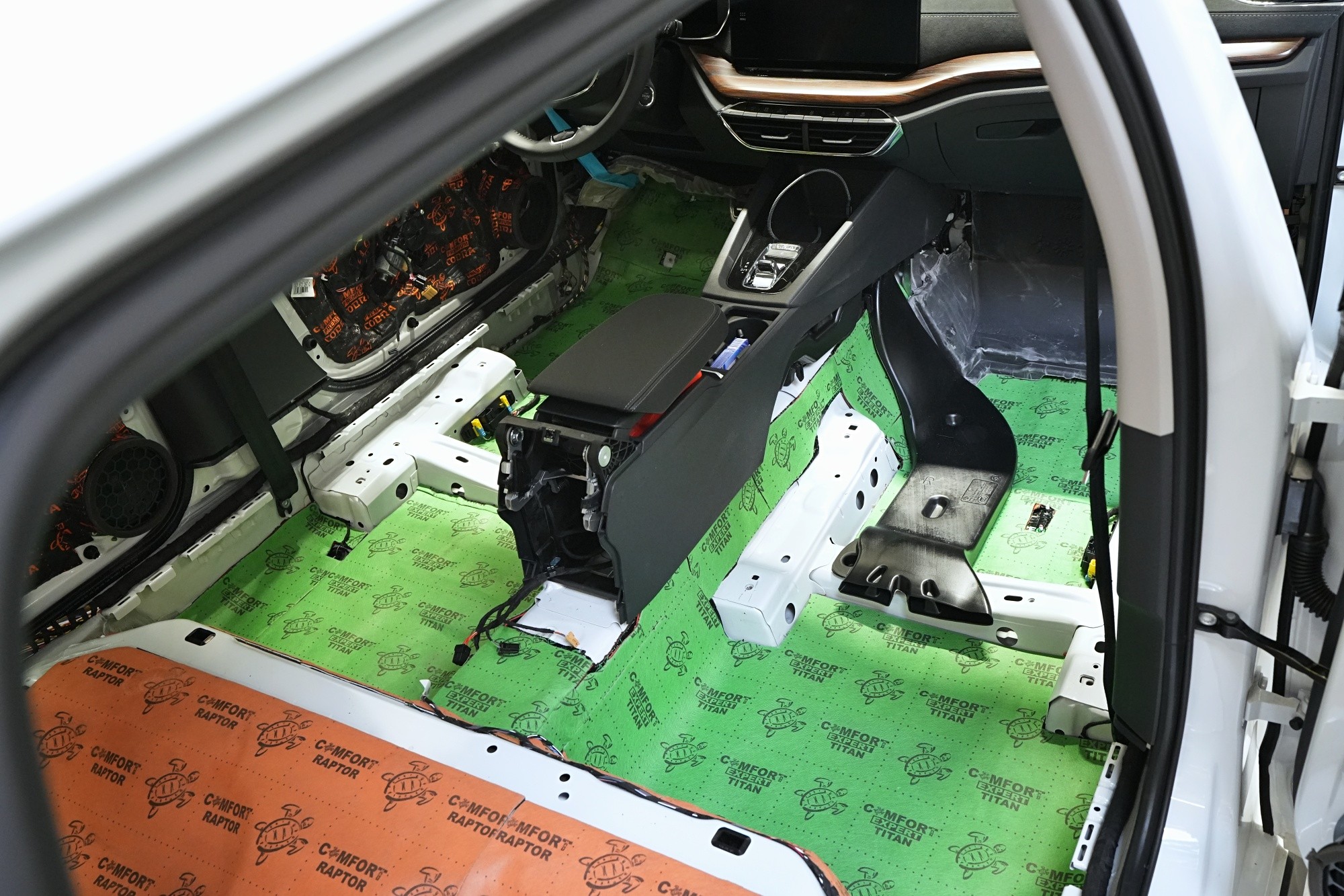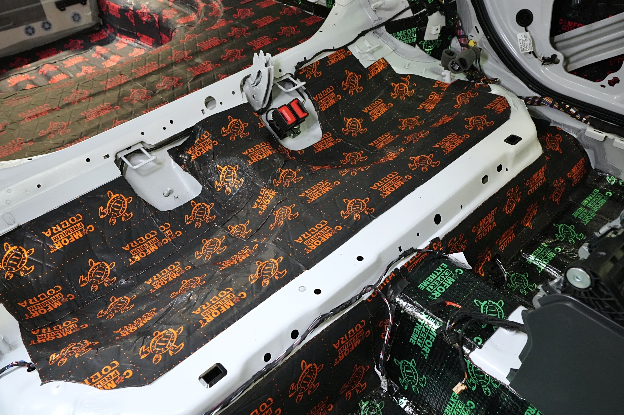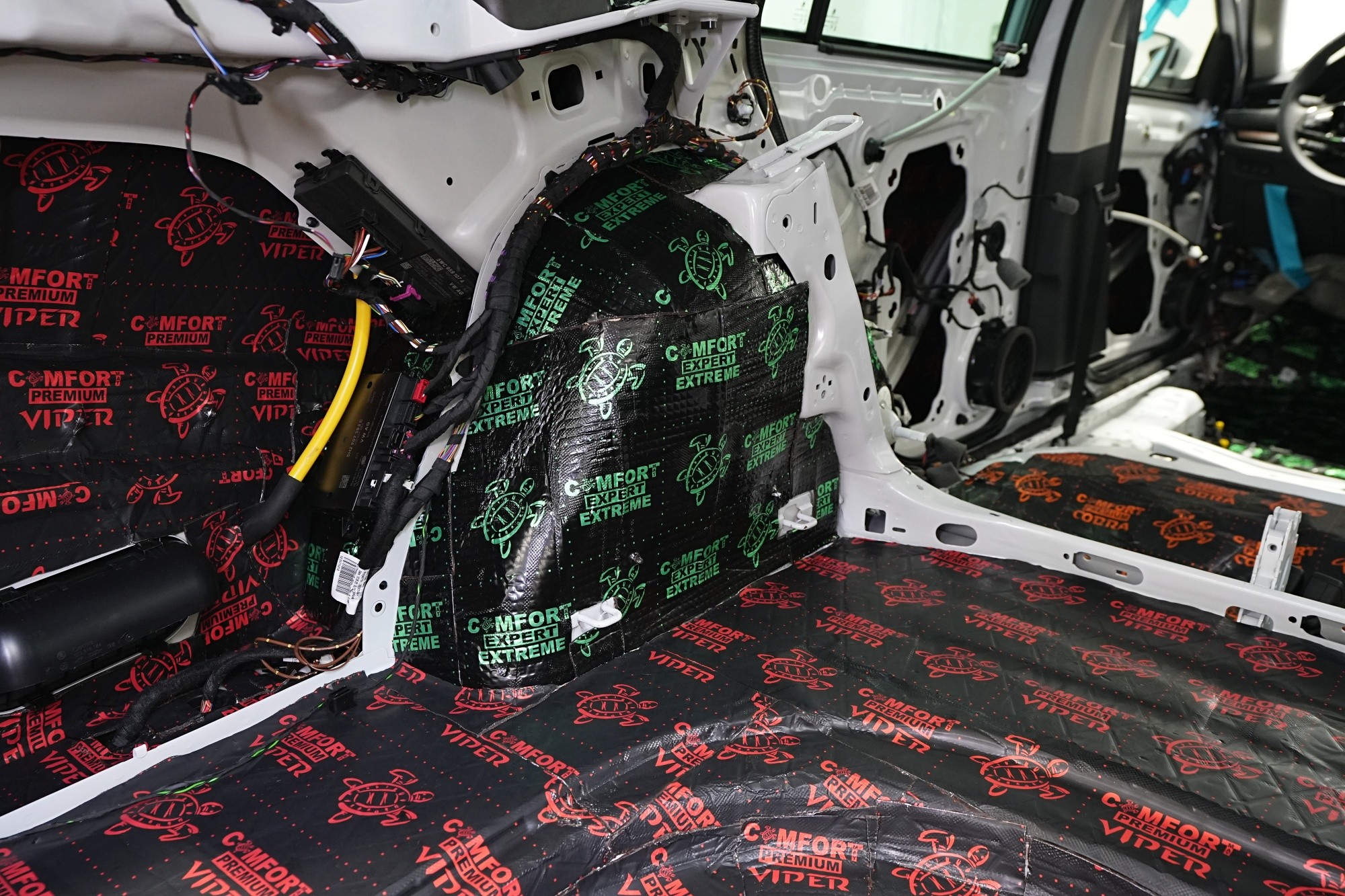K celkovému odhlučnění vozidla nejvíce přispívá důkladné odhlučnění podlahy, která je kvůli výrazným vibracím a hluku zejména o nízkých frekvencích nejvíce náročná na použití správných materiálů. I proto u balíčku Expert Plus používáme profesionální antivibrační materiál Comfortmat Extreme, který při své tloušťce pouhých 3,5 mm poskytuje akustický ztrátový činitel (MLF) 0,63 jednotek. To z něj dělá nejúčinnější antivibrační materiál na trhu o tloušťce do 4 mm a perfektně se tedy hodí do našich instalací zaměřených na maximální účinnost.