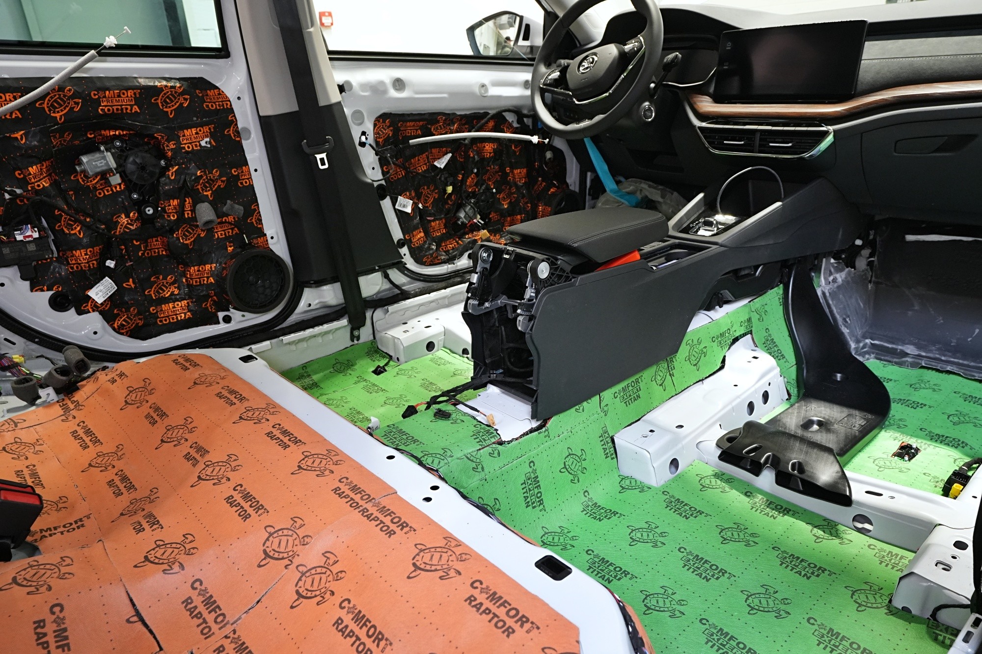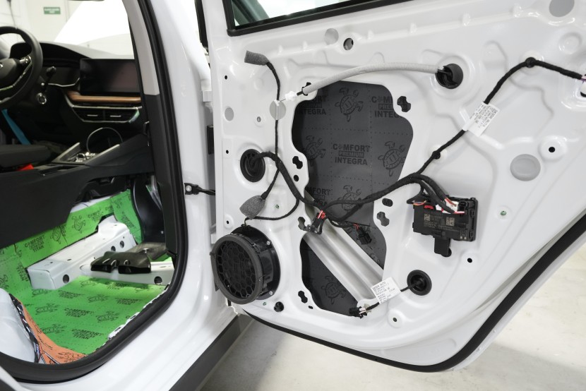 Odhlučnění Škoda Octavia čtvrté generace. Tak jako předchozí modely začíná být i "čtverková oktávka" stálicí na naší dílně. Ničím nechráněné plechy karoserie způsobují výrazné vibrace a vzduchem přenášený hluk a není tedy s podivem, že se na nás majitel tohoto vozu obrátil. Dělat auta tichá je naším posláním i vášní a i z této Octavie uděláme během jednoho dne prémiovku, alespoň co se týče zvukové izolace. Naším úkolem je tedy zamezit vibracím a všudypřítomnému hluku aplikací špičkových antivibračních a zvukově izolačních materiálů Comfortmat v rámci našeho balíčku odhlučnění Premium Plus. Ten je díky nejúčinnějším materiálům z nejvyšší řady Comfortmat Expert zaměřen zejména na hluk pronikající od předních a zadních podběhů a podlahy. Odhlučnili jsme tedy všechny zásadní oblasti vozu, konkrétně přední, zadní a páté dveře, podlahu, zavazadlový prostor včetně zadních podběhů, torpédo a přední podběhy ze strany interiéru. Na odhlučnění pracují zároveň tři naši technici, kteří montáž zvládnou v rámci 1 pracovního dne. Více informací se dozvíte v naší fotoreportáži.