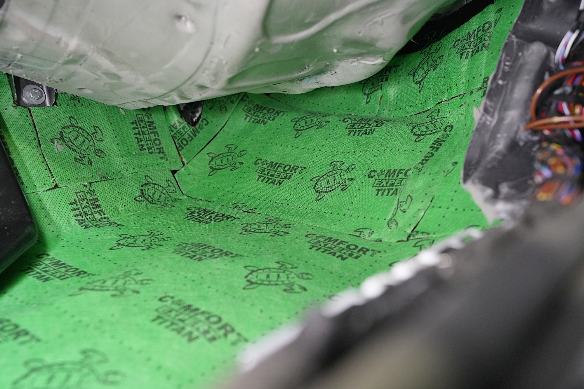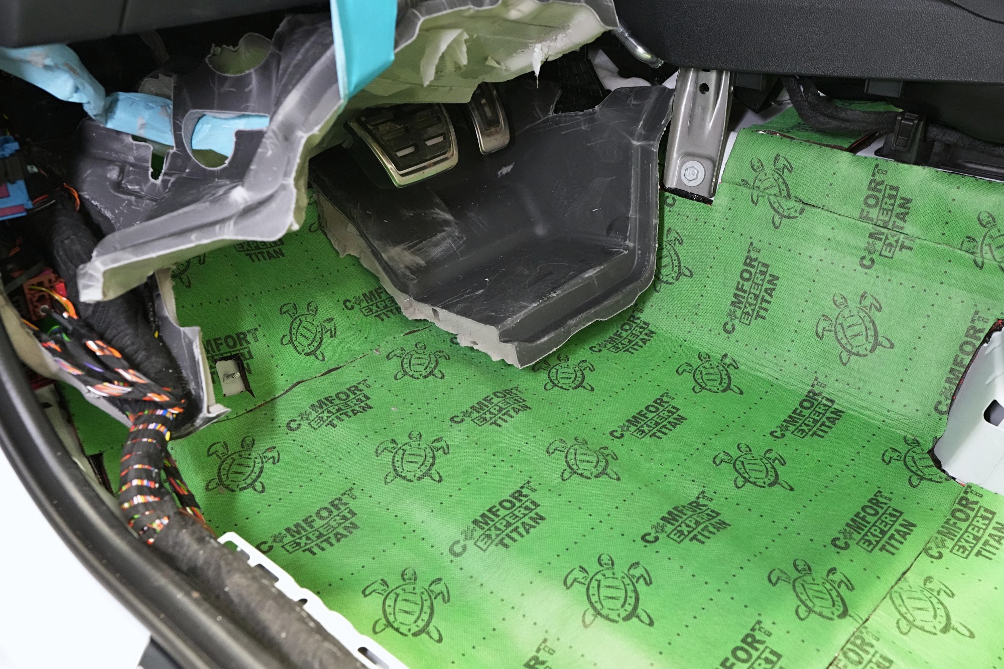 Titan Lite spolu s Extremem aplikujeme na všechny přístupné oblasti, abychom umožnili izolaci maximálního množství vibrací a hluku. V přední části podlahy se dostáváme až pod palubní desku, díky čemuž důkladně odhlučníme i přední podběhy z vnitřní části vozu, kde je přístup k větší ploše karoserie. Tovární odhlučnění v přední části vozu samozřejmě ponecháváme pro další zvýšení účinku našeho odhlučnění.