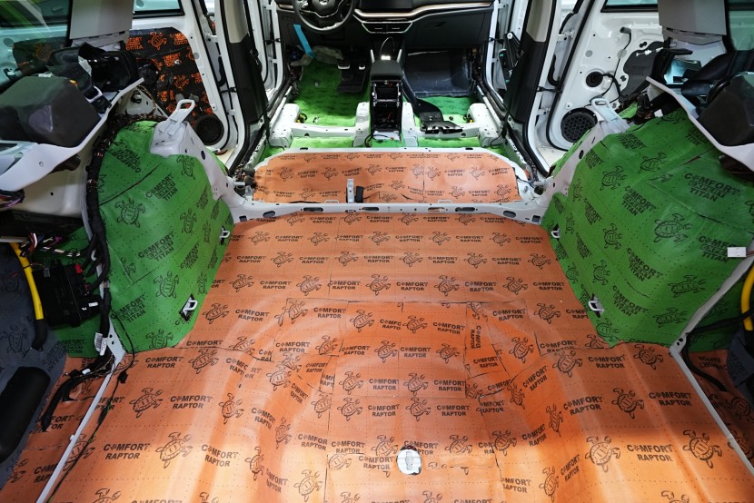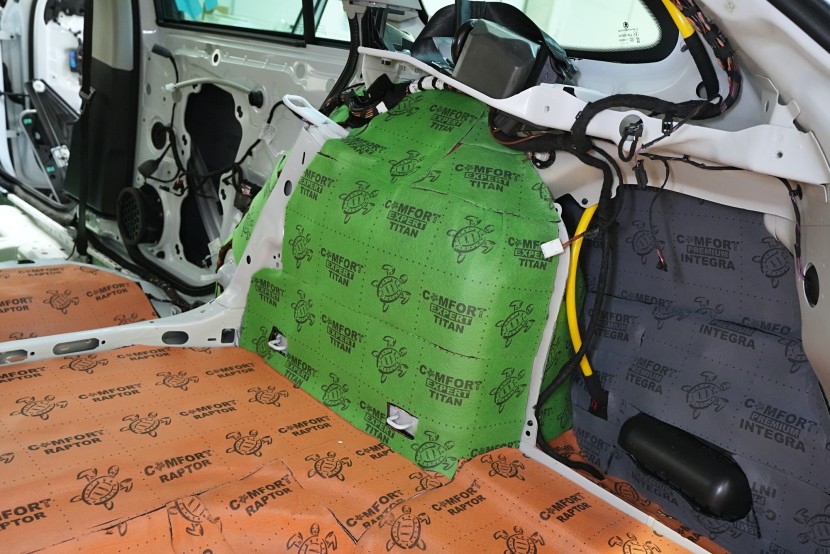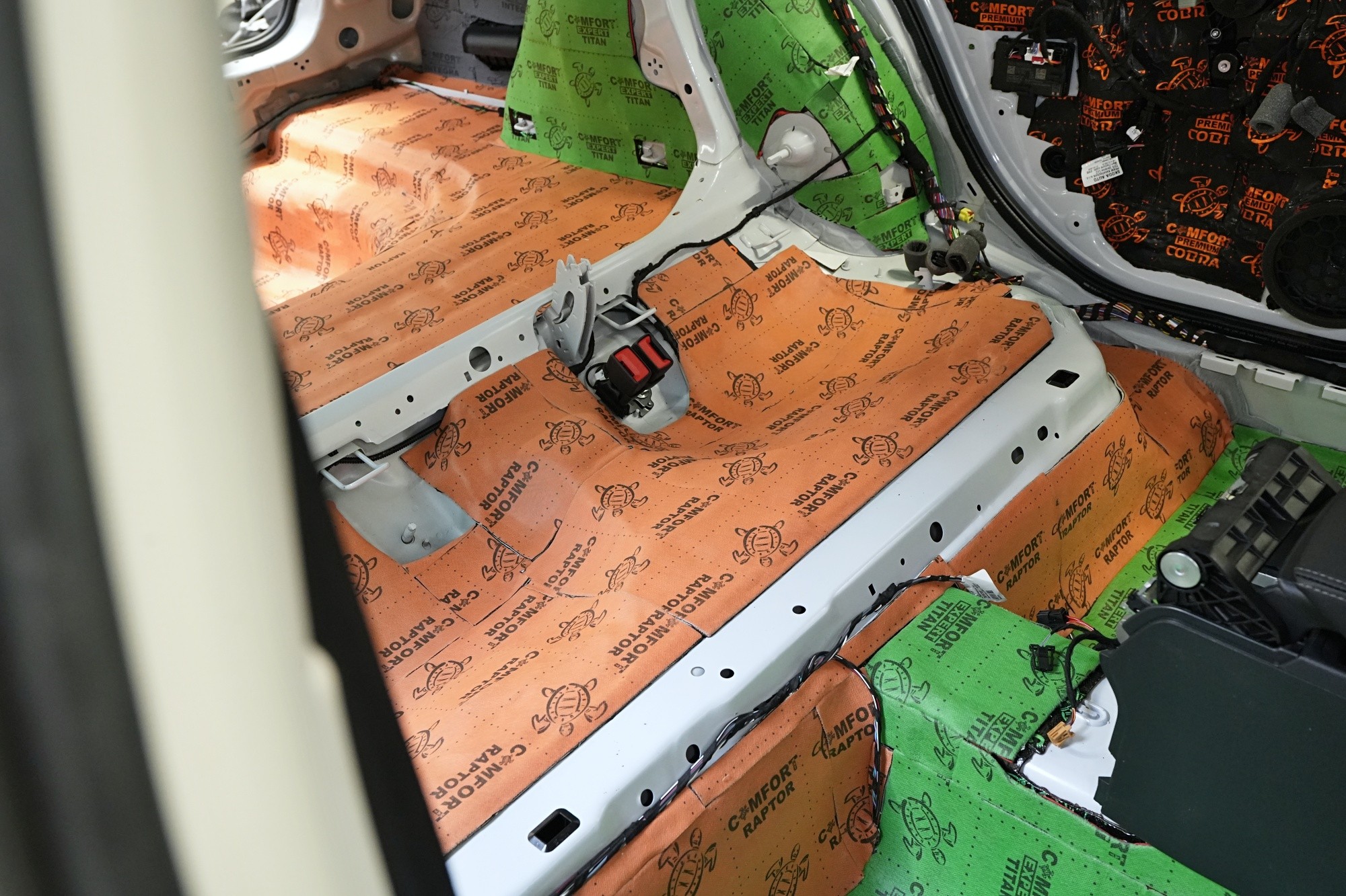 Na prostor pod zadními sedačkami i ve druhé vrstvě aplikujeme membránový zvukově izolační materiál se sníženou tloušťkou, avšak nikoliv na úkor účinnosti. Oranžový Comfortmat Raptor s celkovou tloušťkou pouhých 4 mm obsahuje protihlukovou membránu o síle 2 mm, která přispívá ke schopnosti zvukové izolace až 30 dB. Díky uvedeným vlastnostem je Raptor optimálním řešením pro tyto stísněné prostory.