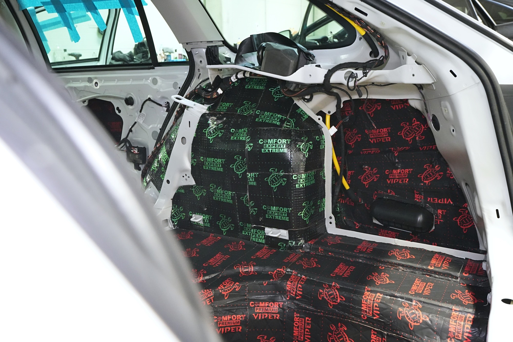 Zavazadlový prostor odhlučňujeme podobným způsobem, protože je nezbytné co nejvíce zamezit všudypřítomným vibracím a hluku od pneumatik pronikat do interiéru. A i proto volíme totožné materiály jako v případě odhlučnění podlahy. Na dno kufru aplikujeme stejný materiál jako pod zadní sedačky, tedy Comfortmat Viper o tloušťce 3 mm a MLF 0,49. Ten nejen absorbuje veškeré vibrace, ale sníží i nízkofrekvenční hluk, který je typický pro tuto oblast.