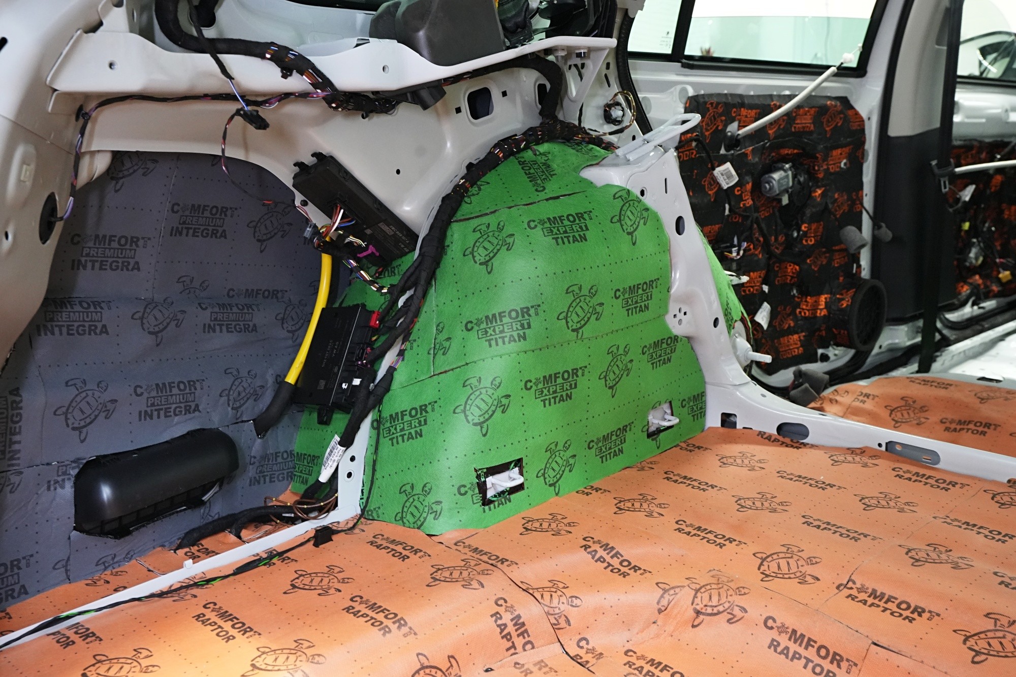 Na zadní podběhy, které jsou nejvíce zatížené vibracemi i hlukem, aplikujeme v první vrstvě stejně jako na podlahu antivibrační materiál Comfortmat Extreme. Tloušťka 3,5 mm a akustický ztrátový činitel 0,63 jednotek umožní důkladné zamezení veškerých vibrací a nízkofrekvenčního hluku od pneumatik, který je typický pro zadní podběhy. A konečně na blatníky aplikujeme u balíčku taktéž antivibrační materiál Comfortmat Viper.