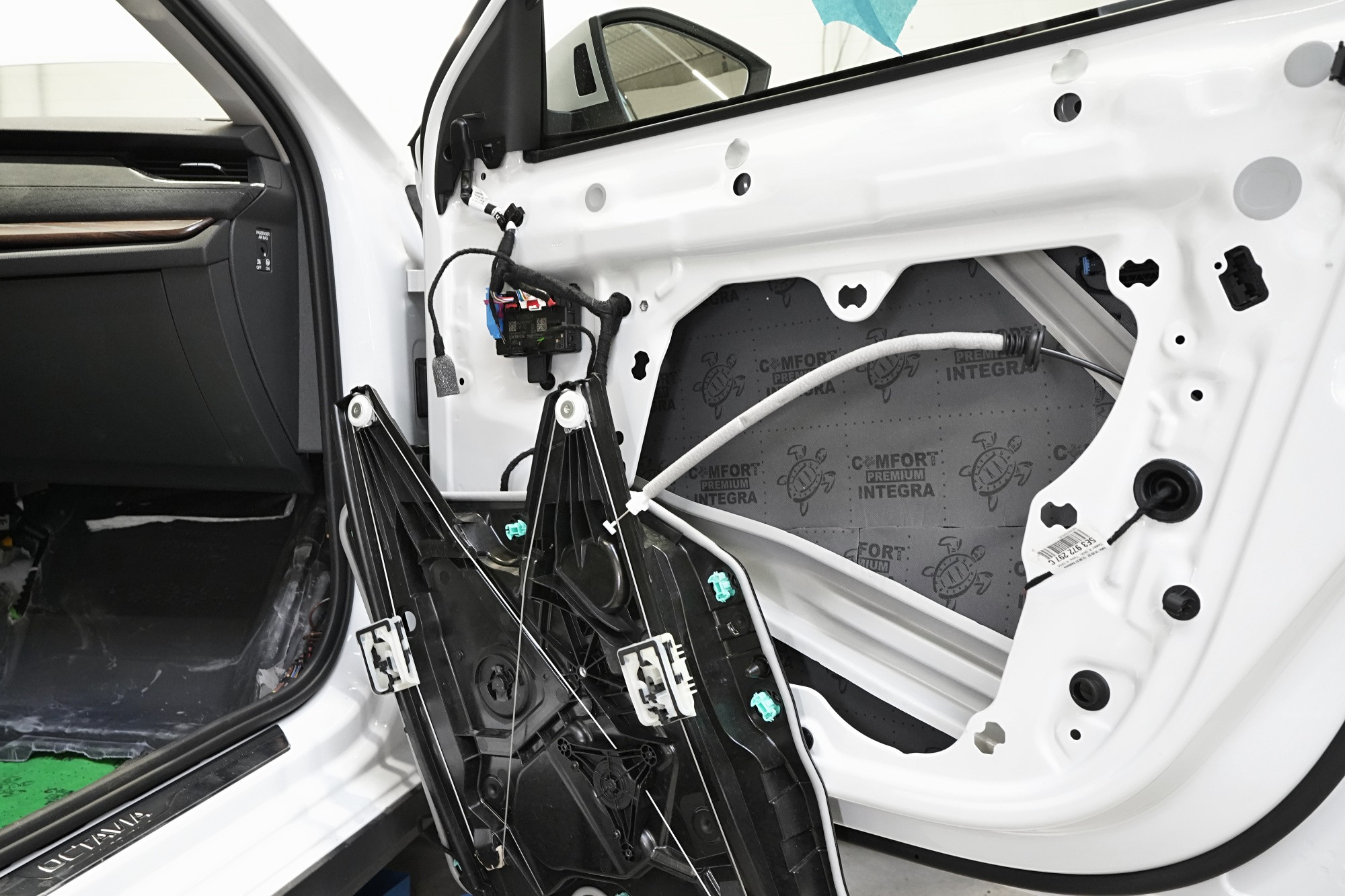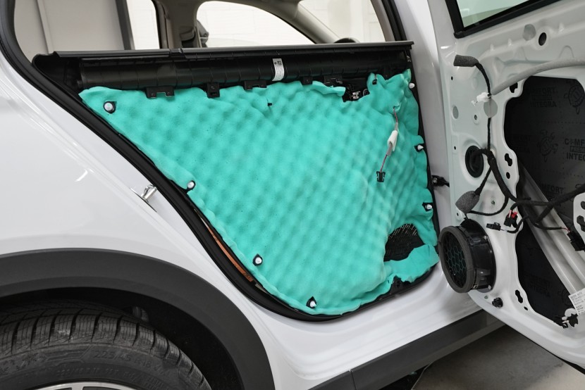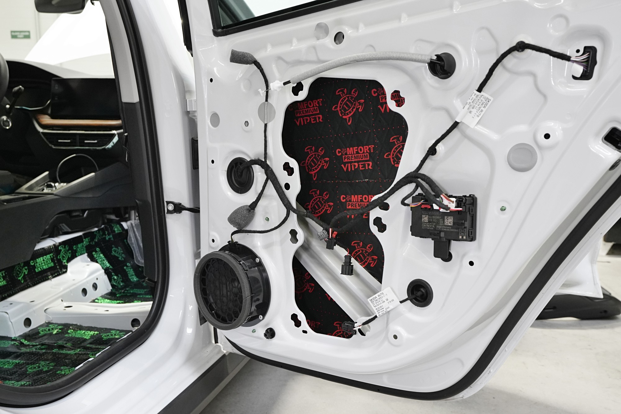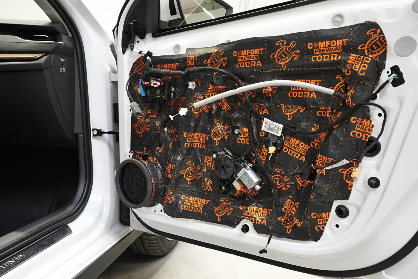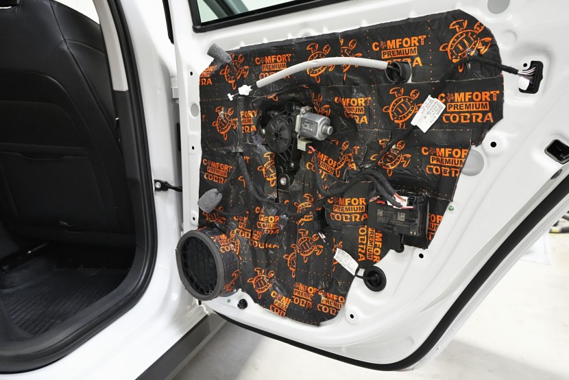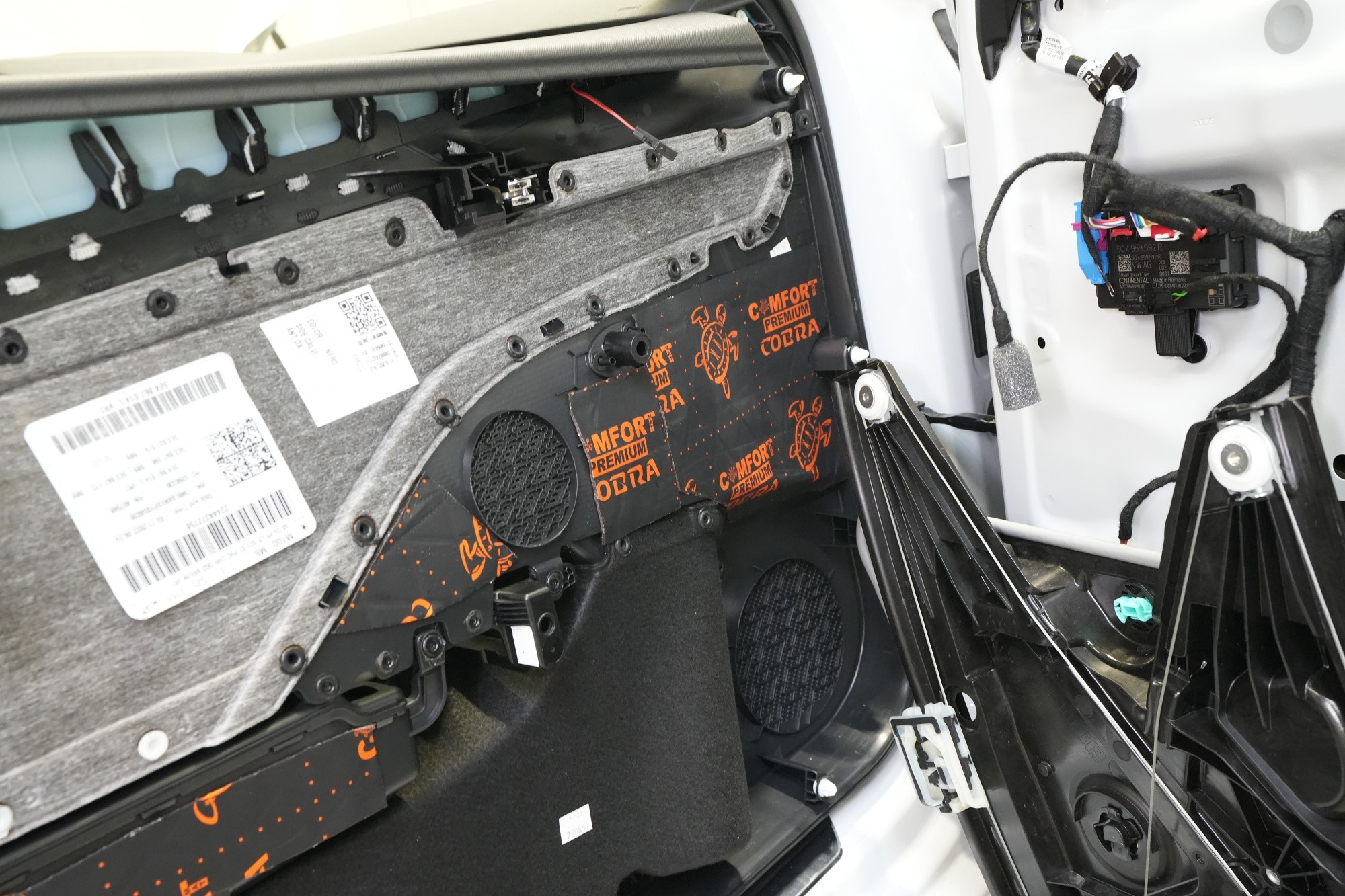 Následně aplikujeme ultralehký antivibrační materiál Comfortmat Cobra. Tato vrstva slouží k zamezení vibrací a rezonancí vnitřního plechu dveří a u většiny vozidel i k vytvoření uzavřené ozvučnice pro reproduktory, což má za následek zlepšení ozvučení. Zejména basová složka středobasového reproduktoru dozná podstatného zlepšení, což oceníte nejen u továrních reproduktorů.