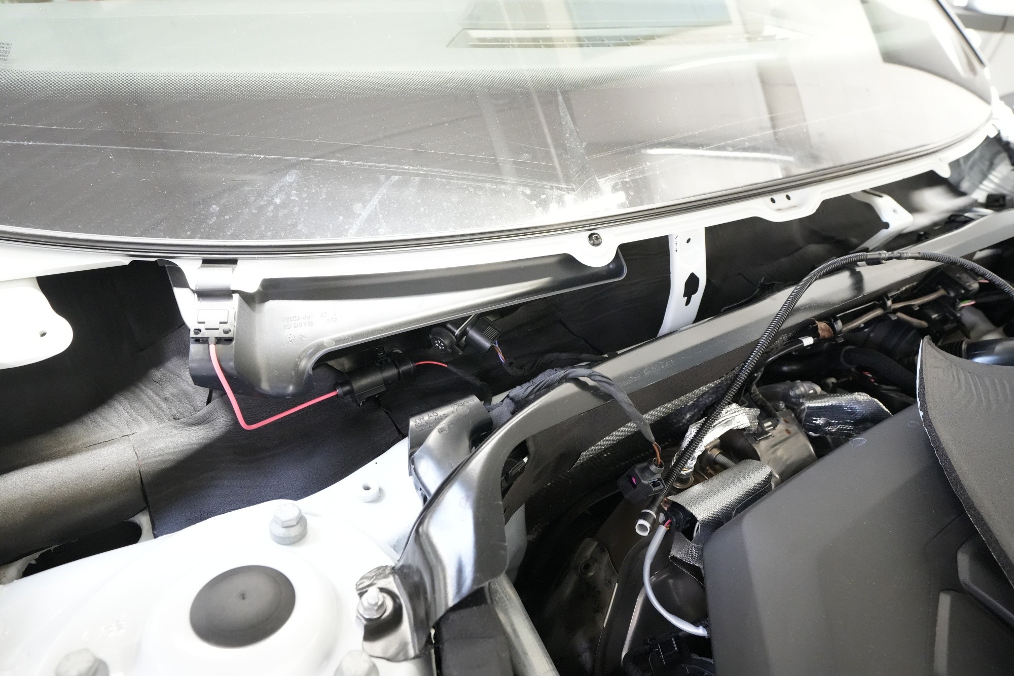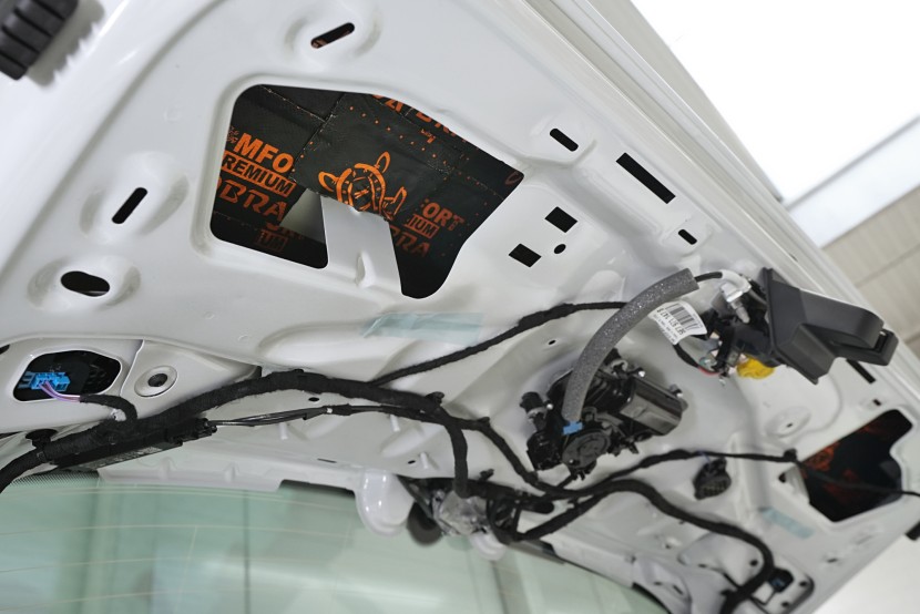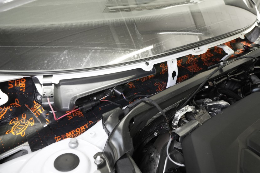 Také odhlučnění torpéda může přinést zajímavé výsledky. Stěrače jsou zdrojem silných vzduchových turbulencí a prostor pod spodním okrajem čelního skla je často veliký. Vytváří se zde efekt zvuku v jeskyni a to v bezprostřední blízkosti interiéru. Druhým důvodem k odhlučnění torpéda je snížení hluku od motoru. Nejprve tradičně aplikujeme antivibrační materiál, konkrétně opět Comfortmat Viper, který odfiltruje silné vibrace motoru.