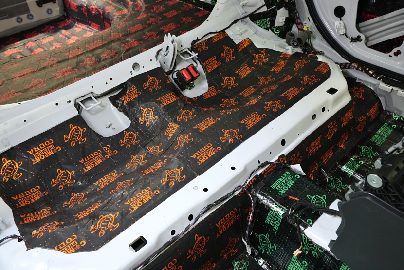 Zadní podběhy opatříme stejným zvukově izolačním materiálem, jaký jsme použili i na odhlučnění podlahy. Comfortmat Titan Lite se vyznačuje při své tloušťce 7 mm rekordní schopností zvukové izolace a kde jinde tento materiál použít, než na zadní podběhy. Nezapomínáme ani na blatníky, na které aplikujeme lehký membránový materiál Comfortmat Integra s účinností 27 dB a velmi nízkou hmotností. Tento materiál využíváme i při odhlučnění dveří, kde ještě více vyniknou jeho vlastnosti.